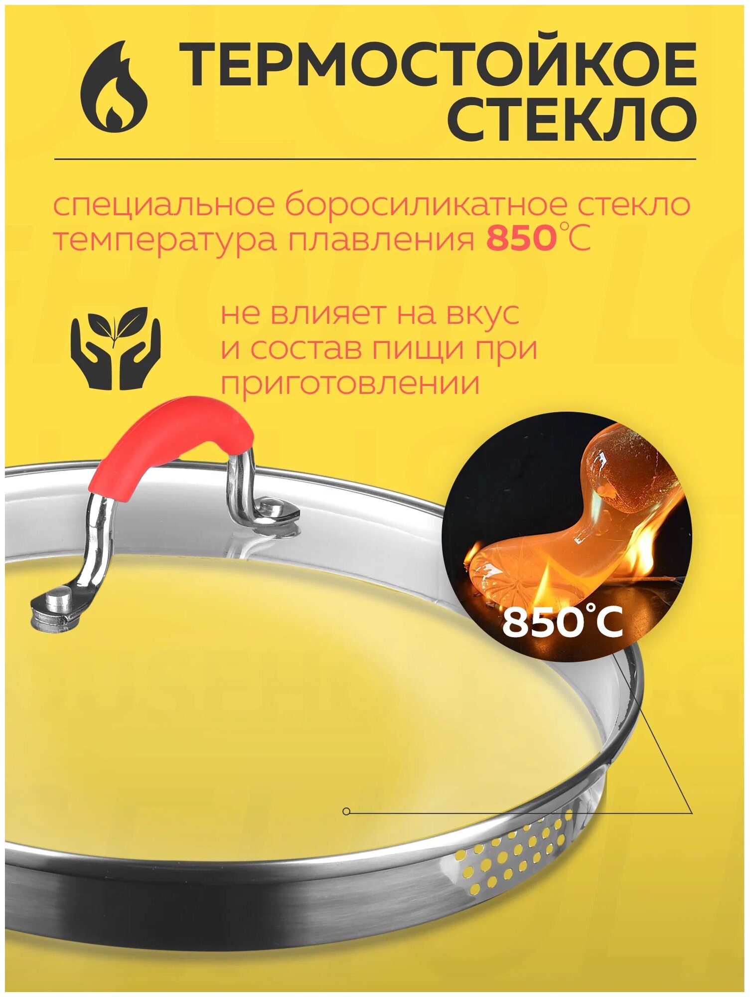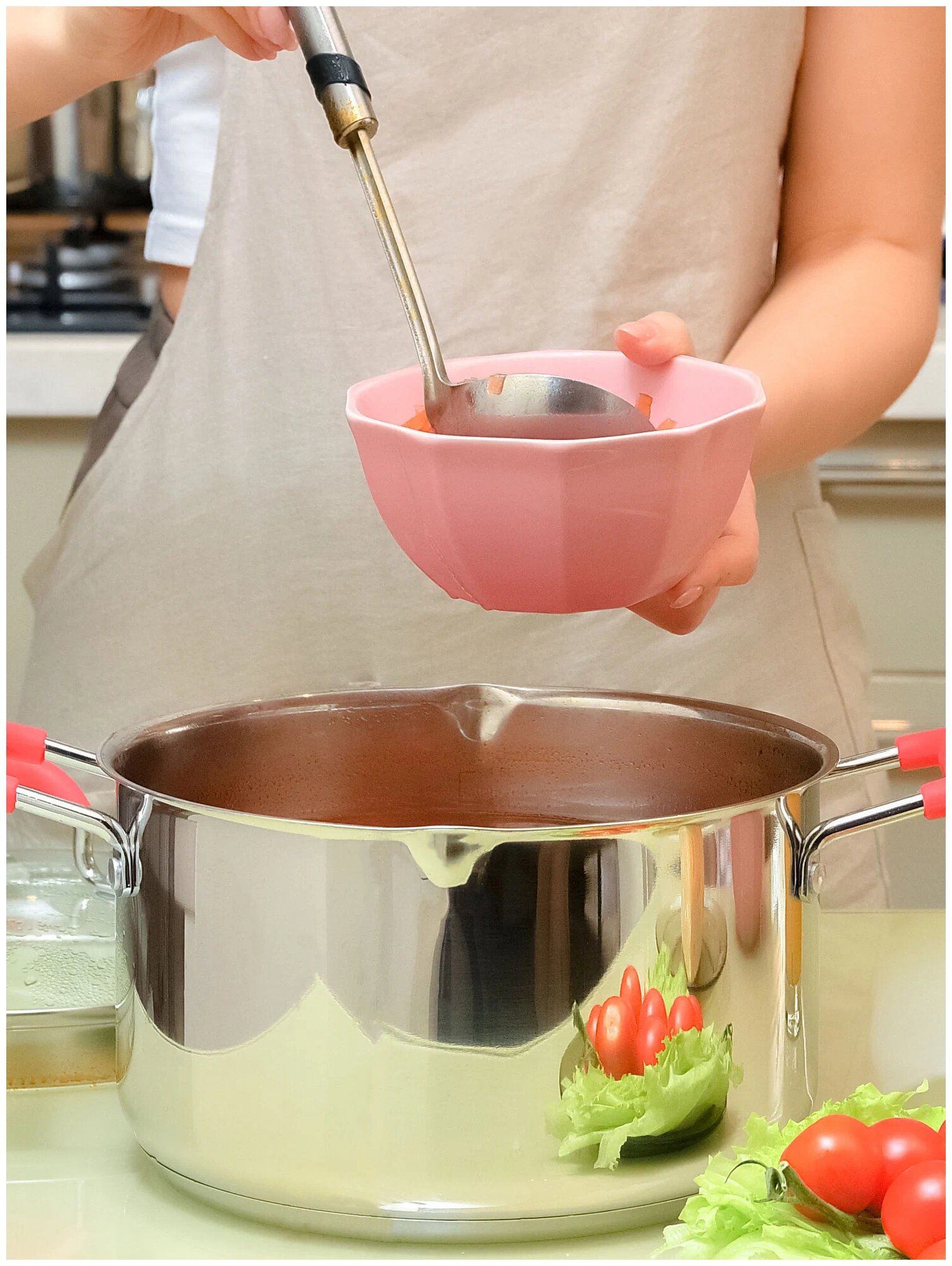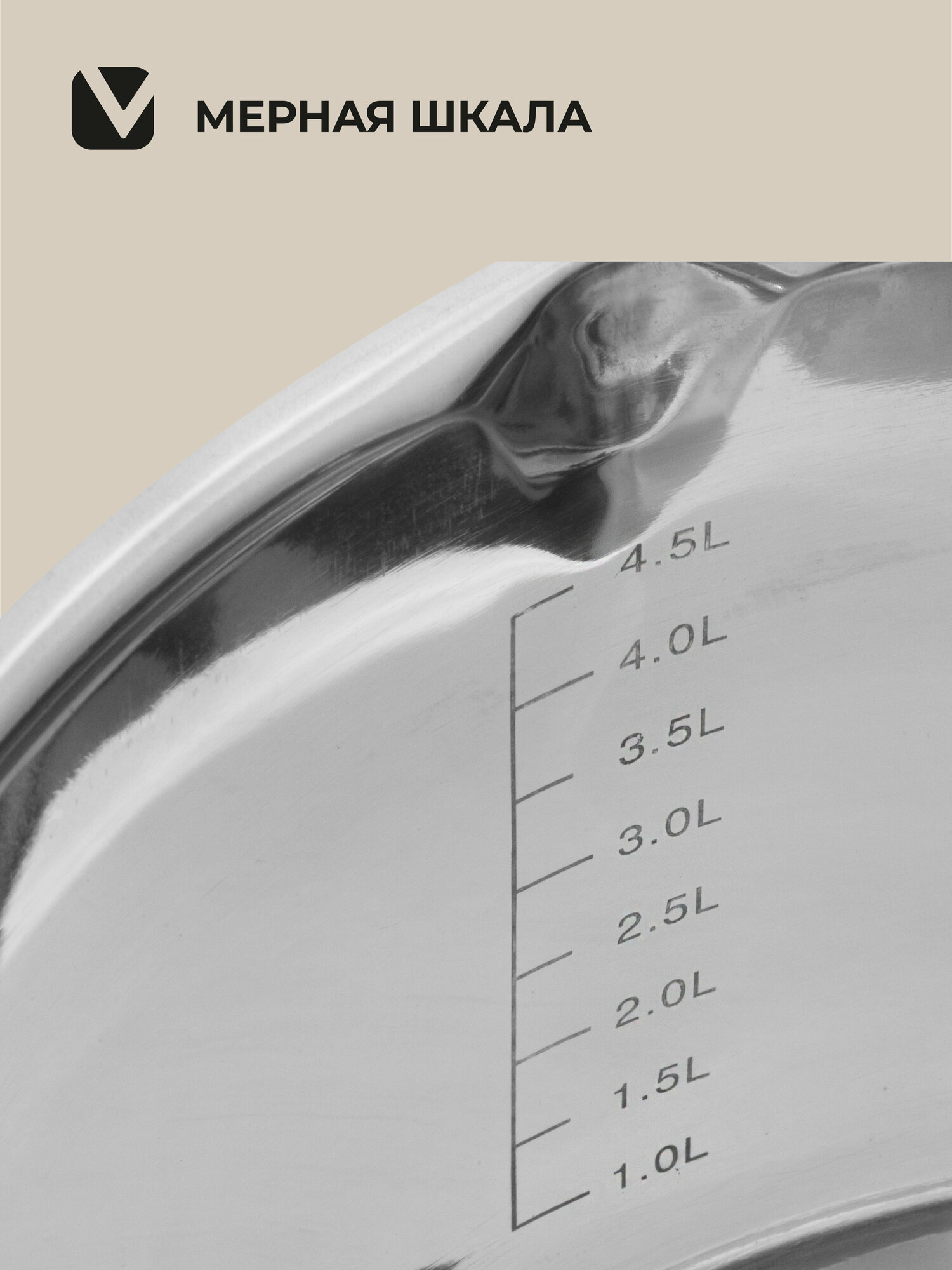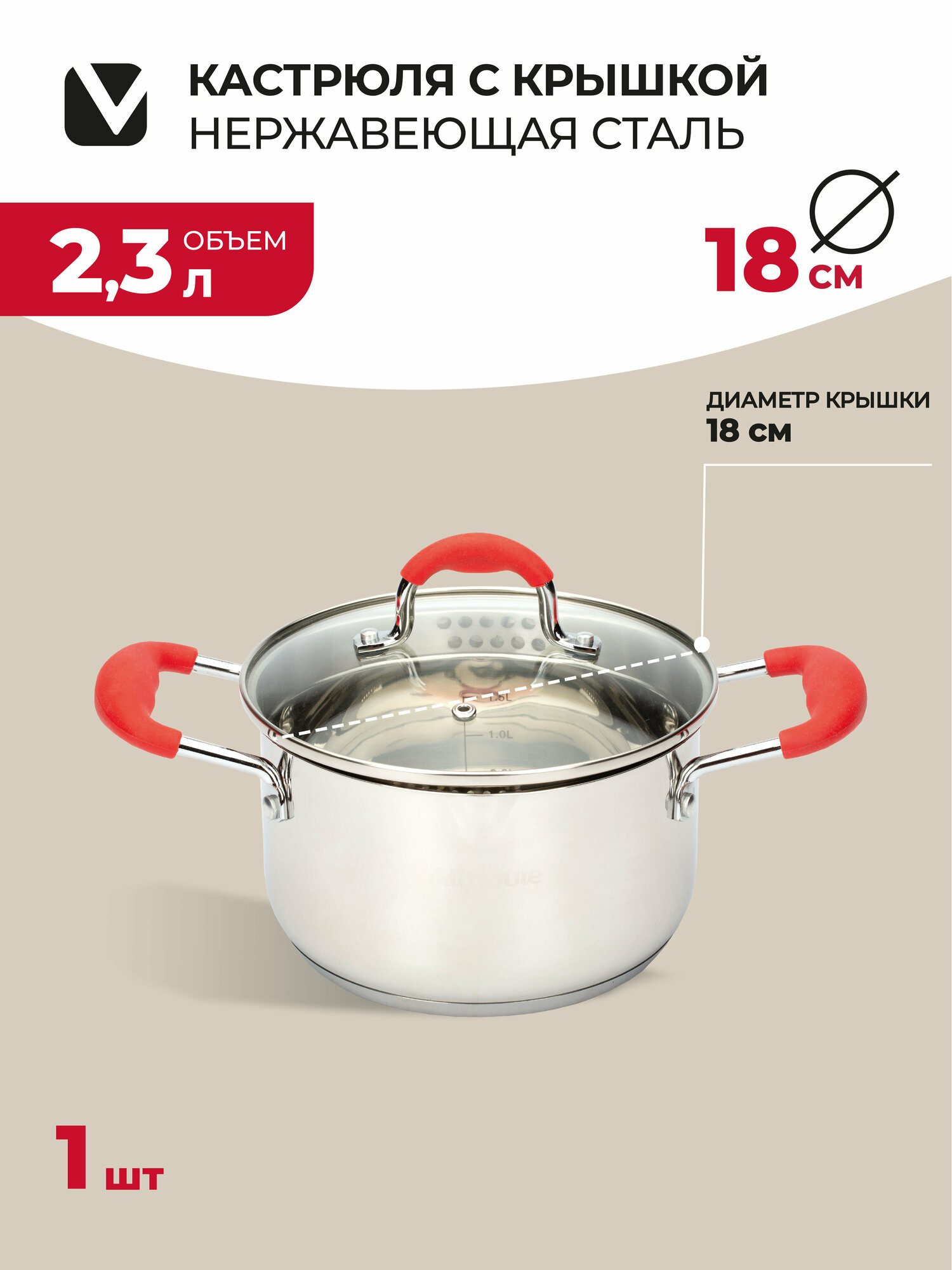 Набор посуды из нержавеющей стали FANCY 6 предметов. В состав набора входит две кастрюли со стеклянными крышками объемами 5,6 л и 2,3 л, а также ковш объемом 0,9 л. Две перфорации на крышке превращают ее в дуршлаг, что помогает сливать только жидкость. Эргономичные ручки из силикона не скользят и не нагреваются. Посуда подходит для любых типов плит, включая индукционные