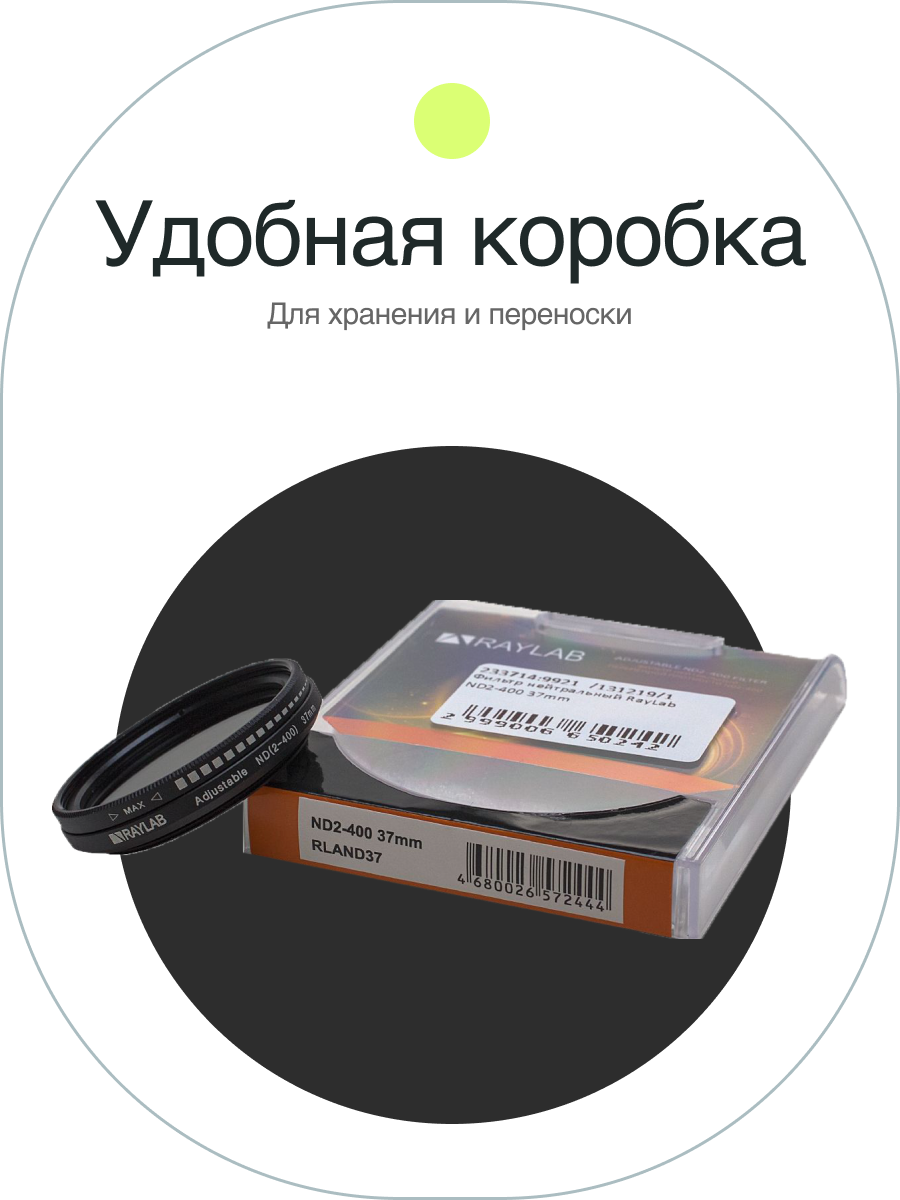 ND2-400 — нейтральный светофильтр переменной плотности от компании Рейлаб, который поможет фотографу четко регулировать количество света, поступающего на объектив. Фильтр отличается широким диапазоном (от ND2 до ND400), высоким качеством и эффективностью.