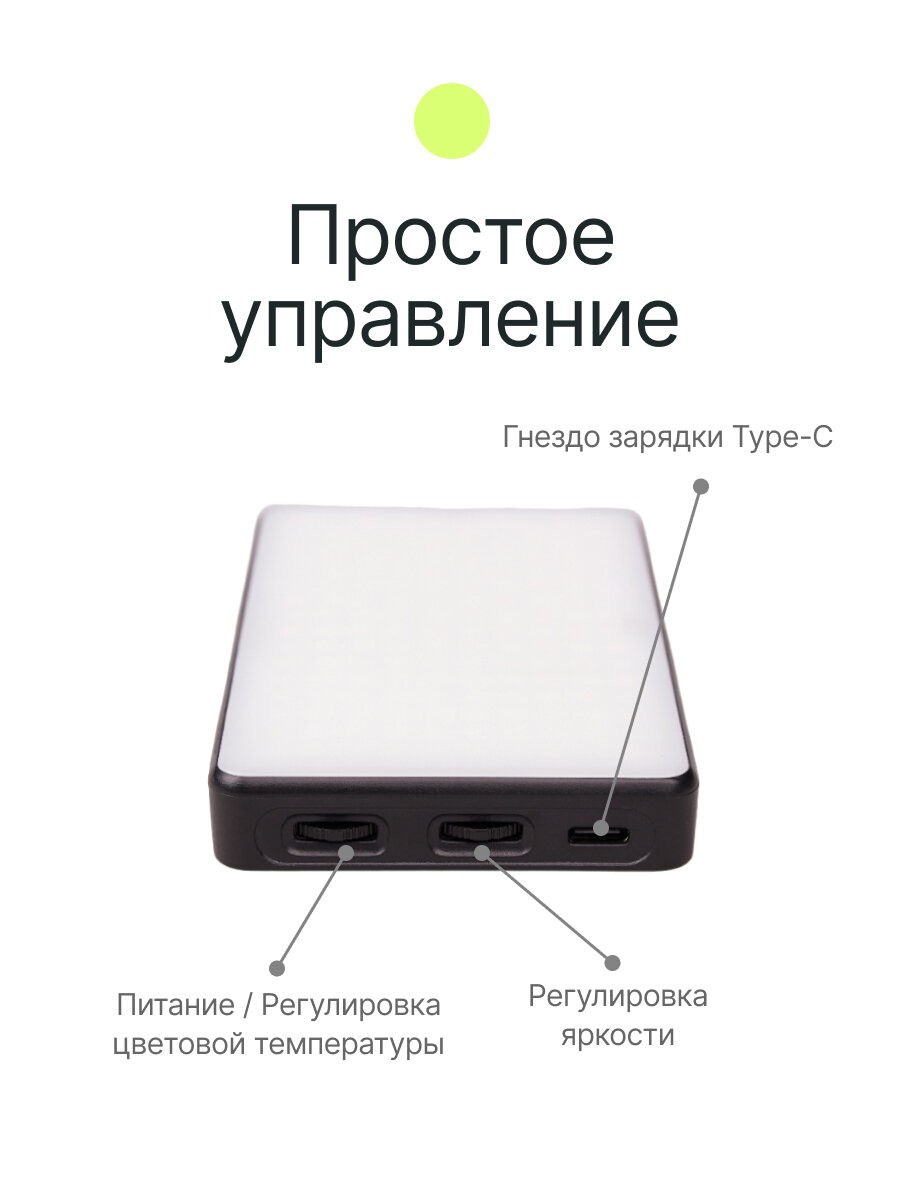 | Комплектация | адаптер, аккумулятор, гелевые цветные фильтры, зарядка USB Type-C, осветитель, силиконовый софтбокс, упаковка |
