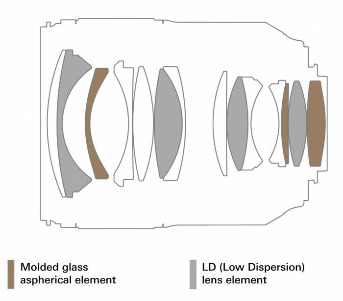 | Конструкция объектива | 14 элементов в 10 группах (4 низкодисперсных элемента LD и 3 асферических элемента GM) |