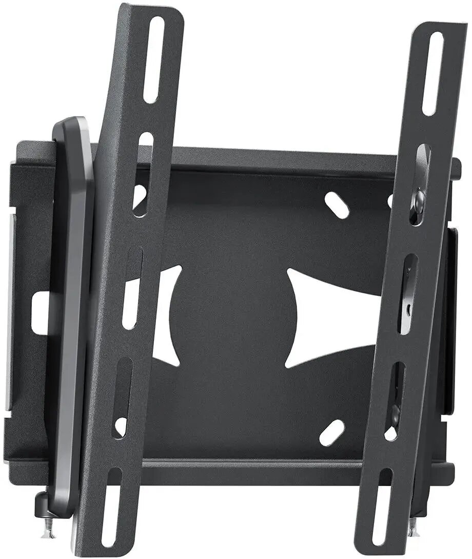 Фиксирующий механизм надежно удерживает телевизор. Телевизор с легкостью выравнивается по горизонтали. Угол наклона ТВ меняется движением одной руки без использования инструмента. В набор входят все необходимые крепежи и инструкция по установке.