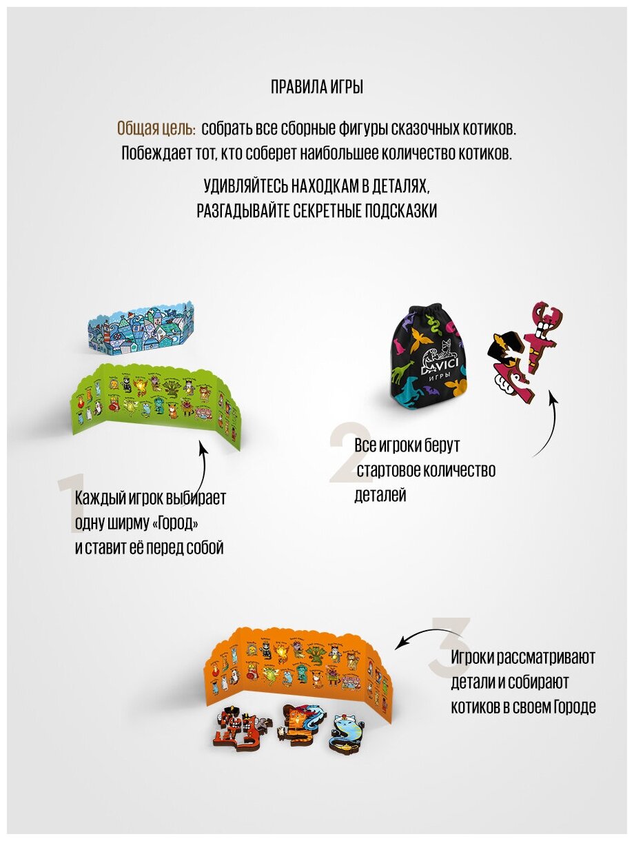 Сложить как можно больше котиков, запоминая и угадывая ходы других игроков и применяя хитрую стратегию обмена деталей!