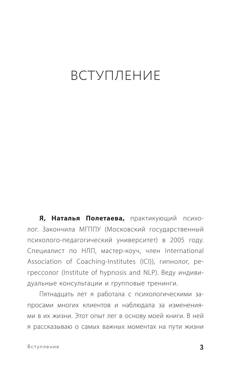 Наталья Полетаева — психолог, специалист по НЛП, мастер-коуч, гипнолог, регрессолог, тренер ТМ Karmalogic. Ведет индивидуальные консультации и групповые тренинги. Пятнадцать лет работает с психологическими запросами многих клиентов. Этот опыт лег в основу книги «Путь человека: истоки сложностей и успеха взрослой жизни». В ней Наталья рассказывает о самых важных моментах на пути жизни человека.