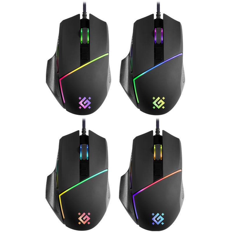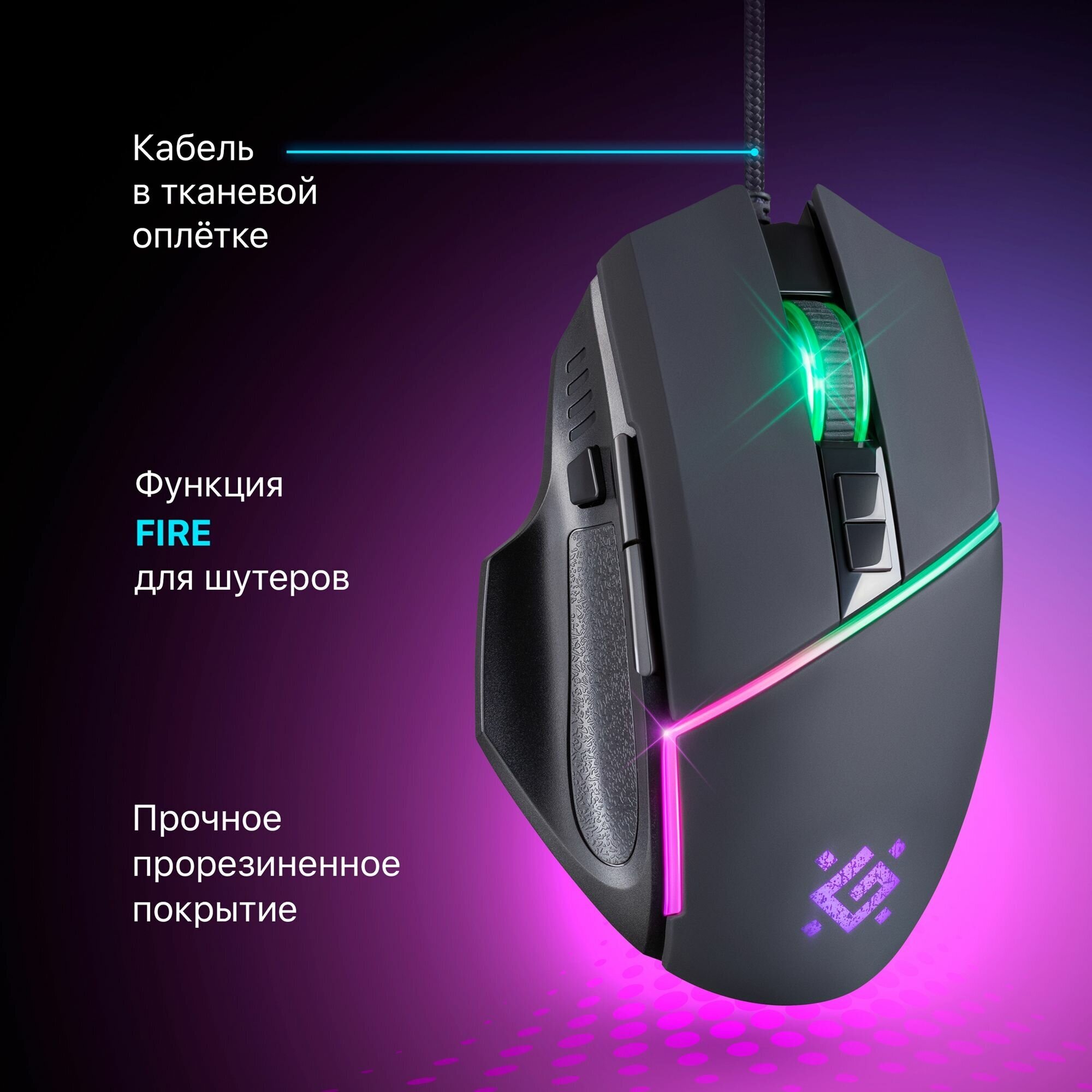 RGB подсветка. Подсветка переключается одновременным нажатием кнопок назад и DPI. 14 режимов подсветки. Переливающаяся подсветка. Программное обеспечение Defender Game Center. Редактор макросов. Эмуляция клавиш клавиатуры. Стабильная работа на высоких скоростях. 6 режимов разрешения. 5 программируемых кнопок. 2 дополнительные боковые кнопки. Высокоточный сенсор. Функция FIRE для шутеров. Подставка под большой палец. Плетеная структура кабеля. Ферритовый фильтр помех. Широкое прорезиненное колесо прокрутки шириной 8 мм с подсветкой. Прочное, приятное на ощупь прорезиненное покрытие.