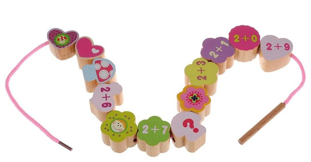 Играя, дети прошнуровывают фигуры верёвочками, вставляя их в специальные отверстия и собирая бусы. Как приятно будет малышке подарить полученное украшение или носить его самой. С помощью игрушки ребёнку не составит труда научиться самому завязывать себе шнурки на ботинках. Компактные размеры игрушки позволят малышу брать её с собой на прогулку или в гости к друзьям.