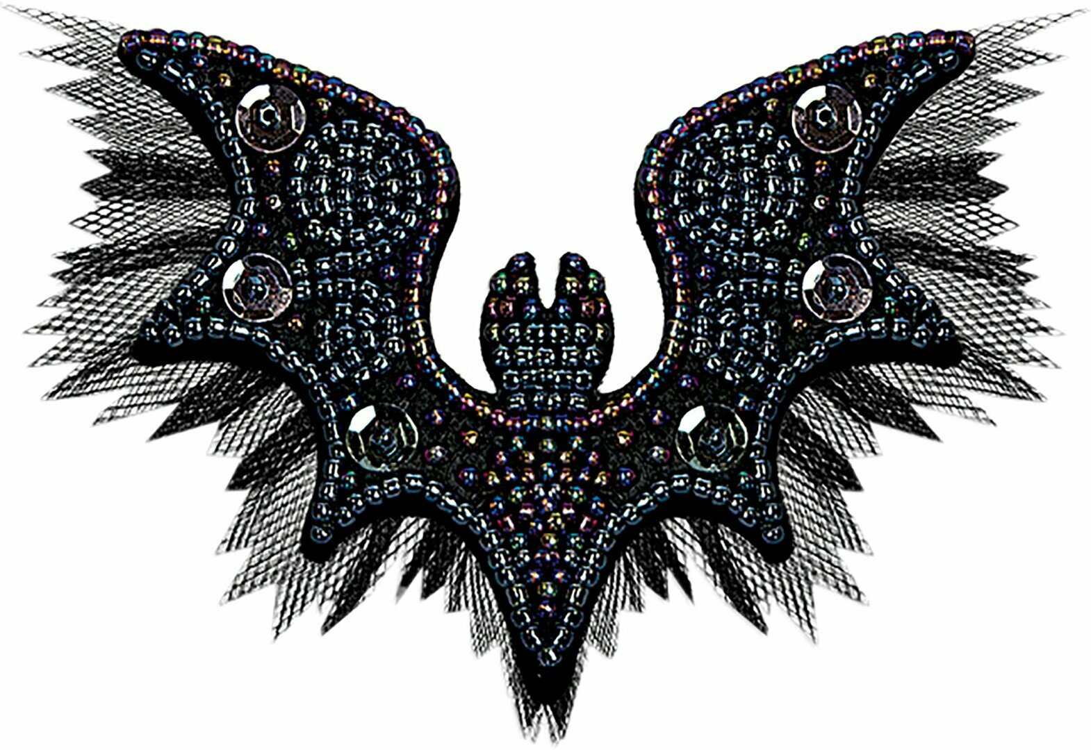Патч, стилизованный под ювелирное украшение в форме летучей мыши, вышитый сверкающим бисером и пайетками на фетре, с декором из фатина, будет прекрасно смотреться как украшение на вечернем платье или сумочке.