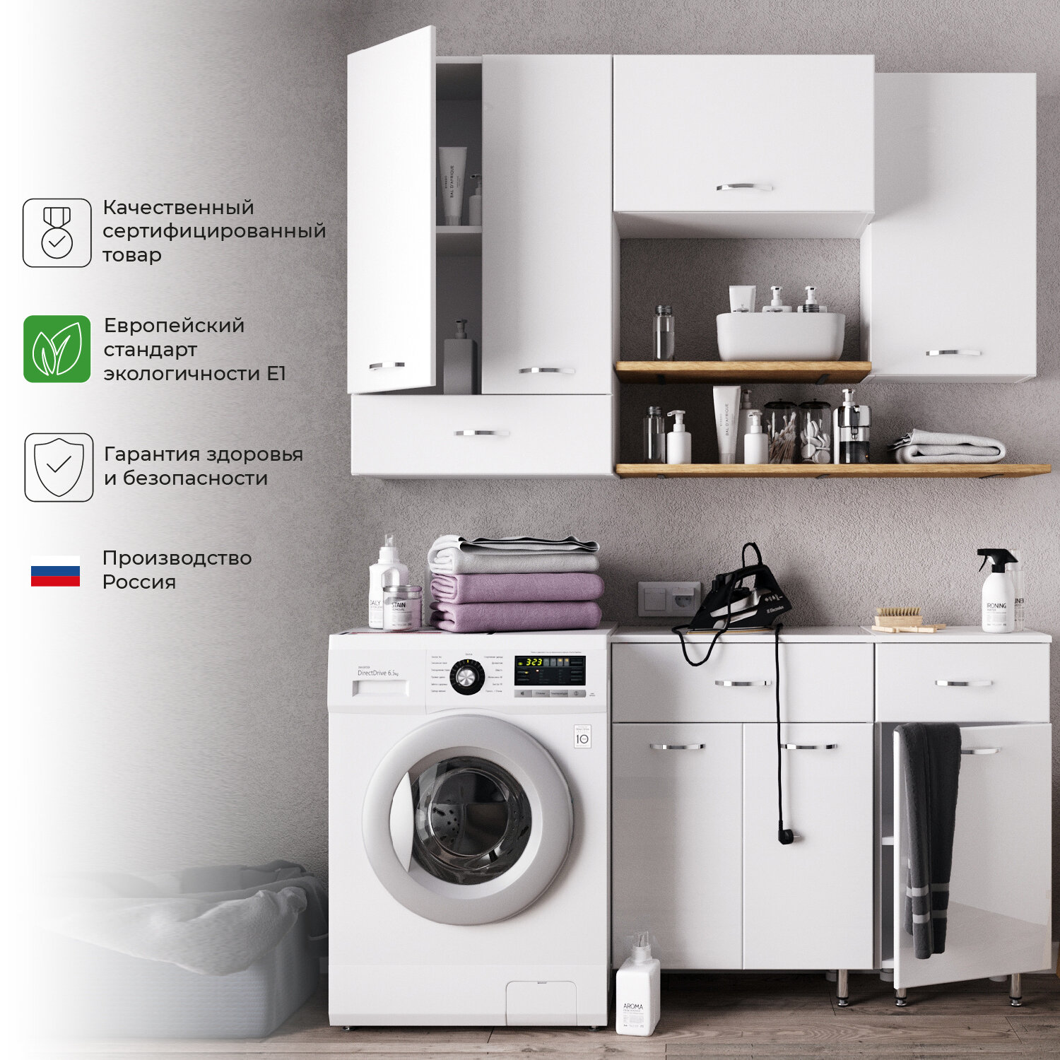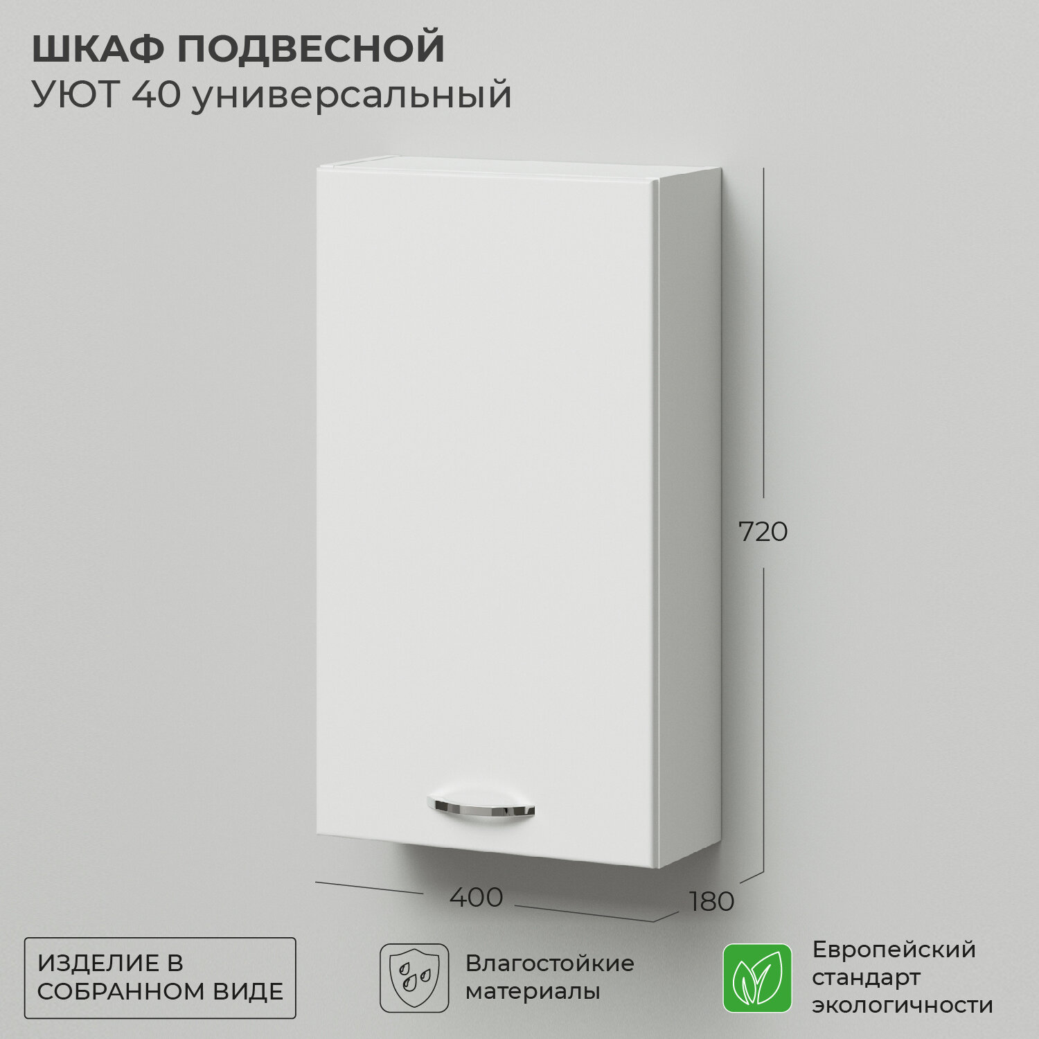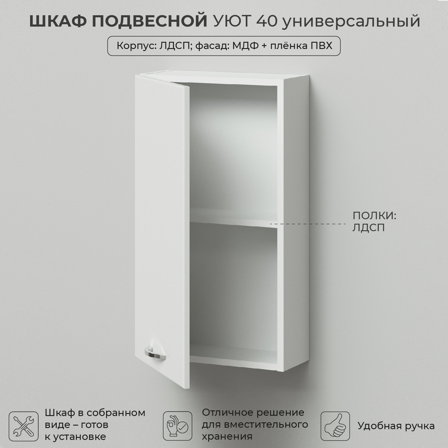 Навесной шкаф из коллекции УЮТ -удобная и функциональная модель. Для хранения бытовой химии предусмотрено пространство за распашным фасадом. Корпус изготовлен из прочной ЛДСП и выдерживает высокие эксплуатационные нагрузки. Фасад из экологичной МДФ,покрытой белоснежной пленкой ПВХ, устойчив к внешним воздействиям и легко очищается. Надежная фурнитура обеспечивает комфортное пользование мебелью.