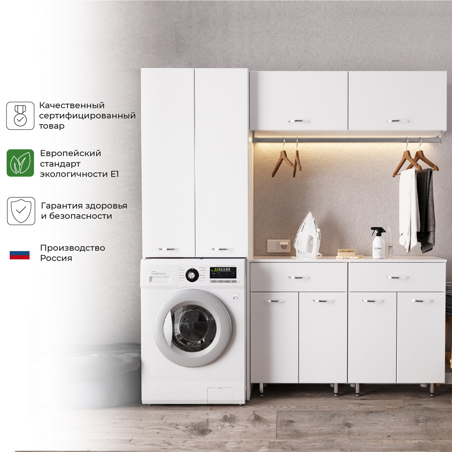 Напольный шкаф над стиральной машиной из коллекции Уют станет отличным дополнением ванной комнаты. Компактное размещение над стиральной машиной позволит эргономично использовать незадействованное ранее пространство. За распашными фасадами на полках можно расположить средства личной гигиены, моющие и чистящие средства. Корпус шкафа выполнен из ламинированного ДСП, фасады из прочного МДФ, покрытые пленкой, что обеспечивает долговечное использование данной модели. Дополнить комплект можно изделиями из коллекции Уют.