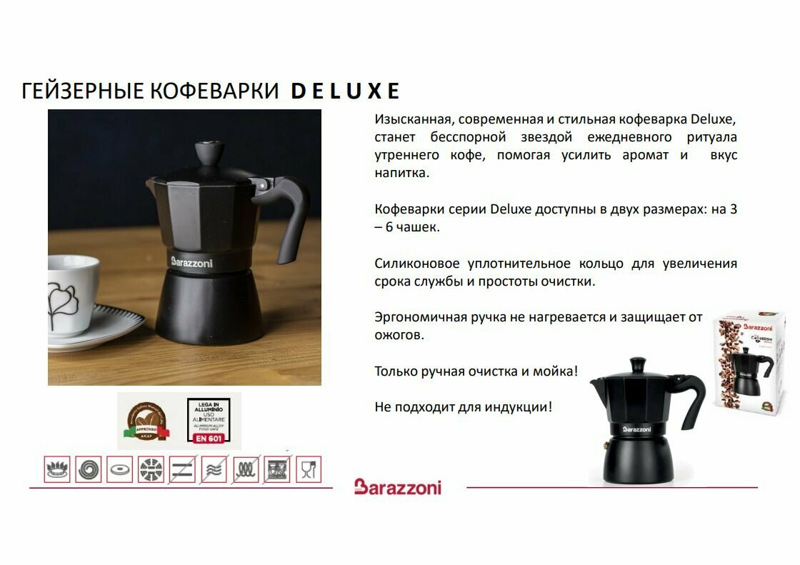 На сегодняшний день товар «Кофеварка на 3 чашки Barazzoni Deluxe цвет черный (830005003)» можно купить с кешбеком в 1 магазине: Яндекс.Маркет