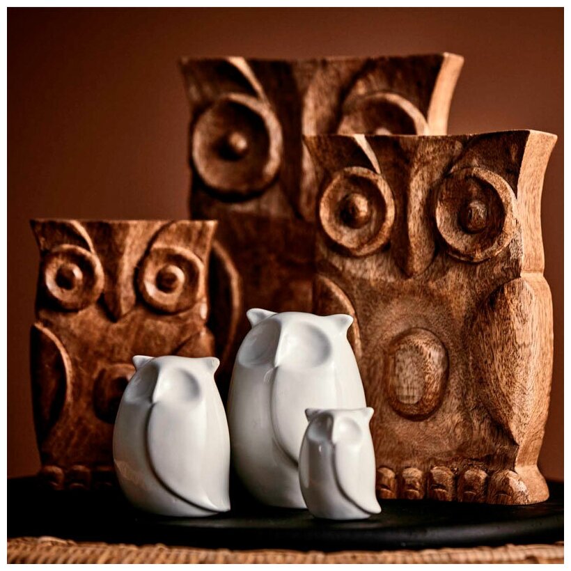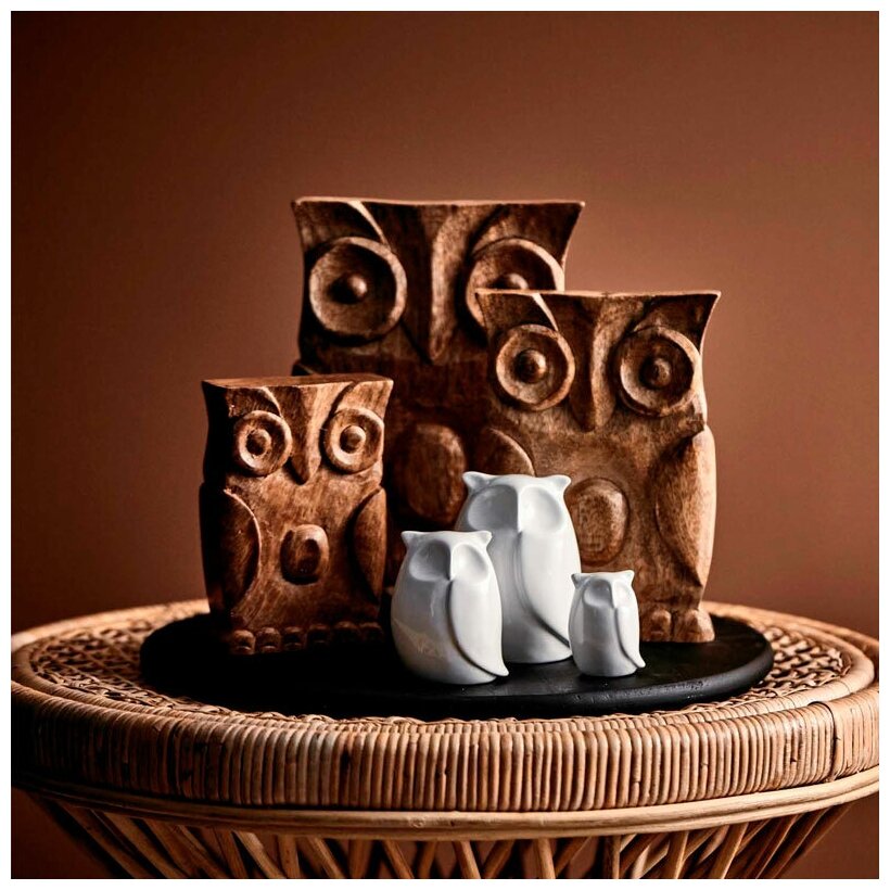 Персонаж ручной работы из серии CALMO создает прекрасную атмосферу. Фигурка совы выполнена из дерева. Уникальный дизайн идеально впишется в интерьер загородного дома. Подходит в качестве подарка.