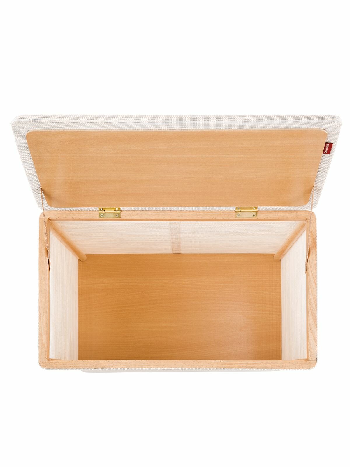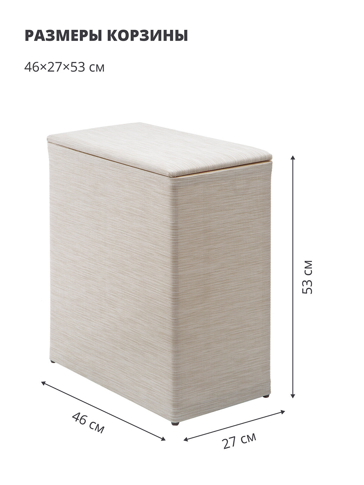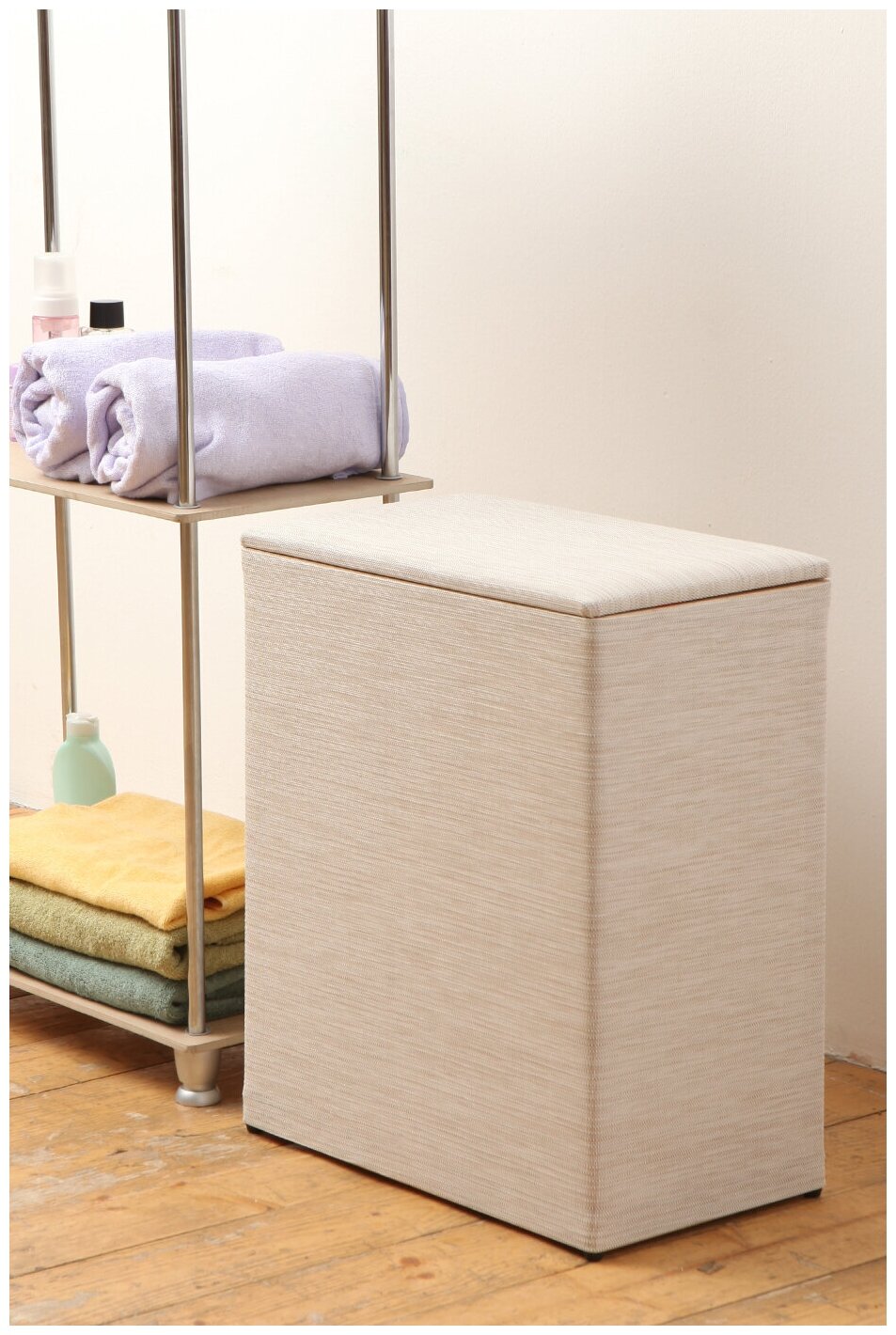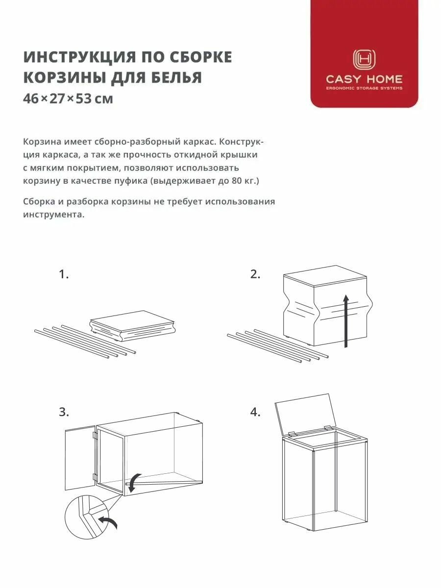 Корзина имеет сборно-разборный каркас из натуральных буковых реек с экологически чистым влагостойким покрытием. Конструкция каркаса, а также прочность откидной крышки с мягким покрытием позволяют использовать корзину в качестве пуфика (выдерживает до 80 кг.) Сборка и разборка корзины не требует использования инструмента. Инструкция по сборке прилагается.