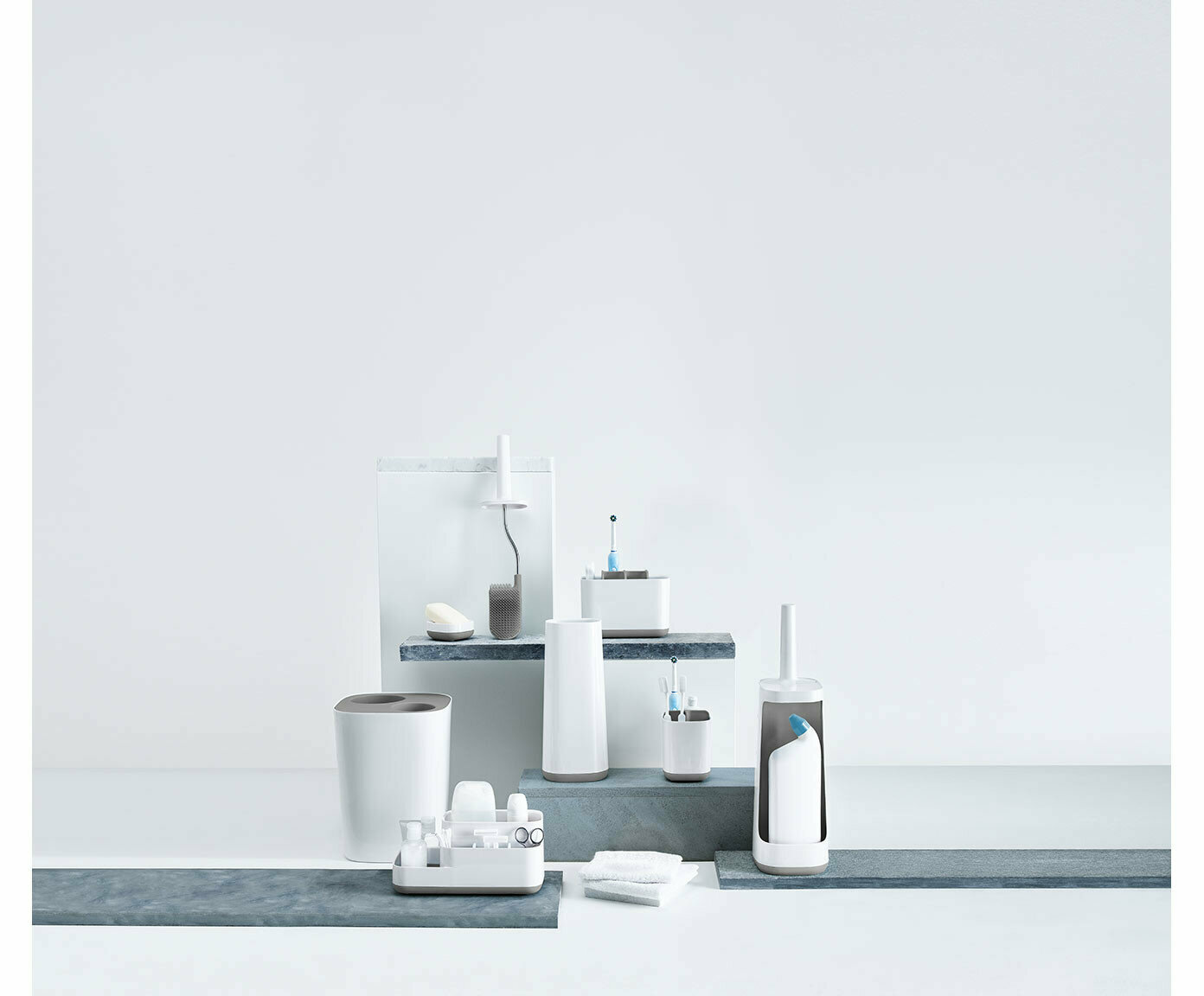Ванная — одна из наиболее сложных для уборки комнат. Здесь вопрос экономии места особенно актуален. Для создания новых аксессуаров дизайнеры Joseph Joseph руководствовались принципами рационального использования пространства, эргономичностью и удобством сортировки.
