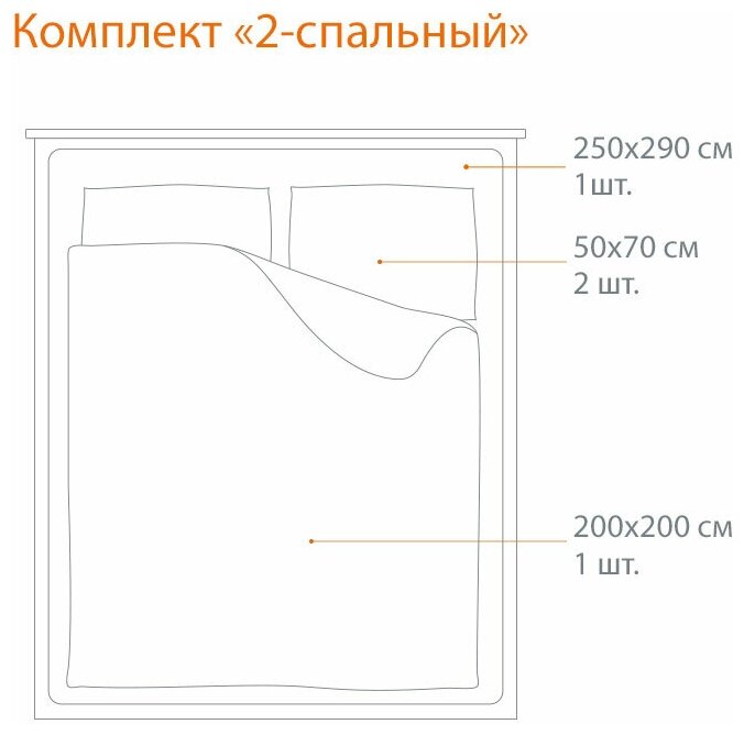 | Комплектация | Пододеяльник 200x200см - 1шт; простыня 250x290см - 1шт; наволочка 50x70см - 2шт. |