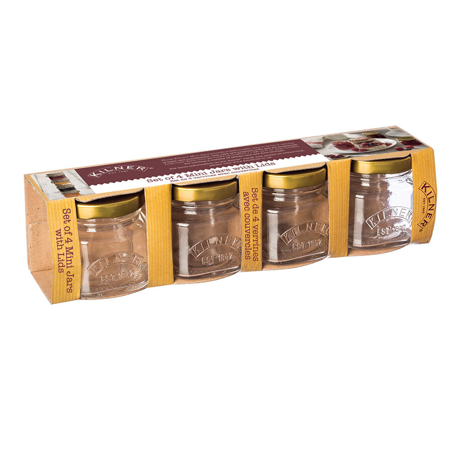 Набор из 4 стильных баночек, которые подходят для хранения джемов, карамели, мёда, специй и разных приятных мелочей. Удобная закручивающаяся крышка плотно прилегает к краям банки и не пропускает воздух. Это позволяет сохранять продукты свежими дольше, чем в пластиковых контейнерах. Банки украшены фирменным логотипом бренда Kilner. Набор упакован в красивую коробку и станет прекрасным подарком любой хозяйке.