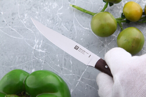 Все составляющие ножа тщательно обработаны, швы в местах соединения отшлифованы и незаметны. Это особенно важно с точки зрения гигиены. Ни на лезвии, ни на рукоятке нет неровностей, где может скапливаться грязь. Лезвие имеет отполированную поверхность, которую сначала шлифуют и зачищают – чем лучше отполирована поверхность лезвия, тем выше степень устойчивости к коррозии. Рукоятка и шейка спроектированы так, что возможность выскальзывания исключена. Эргономичный дизайн и оптимальный вес рукоятки обеспечивают безопасность и удобство в использовании.