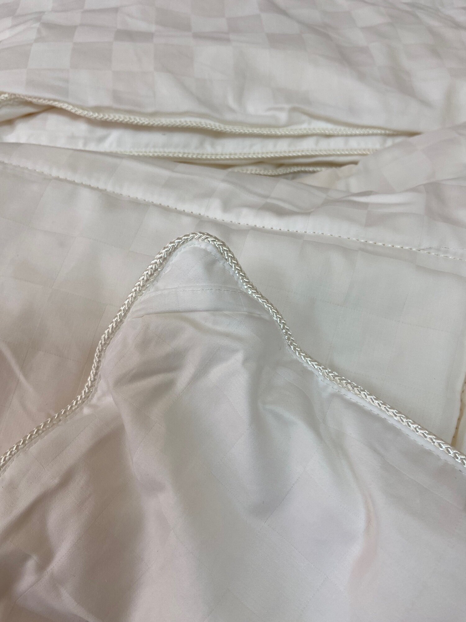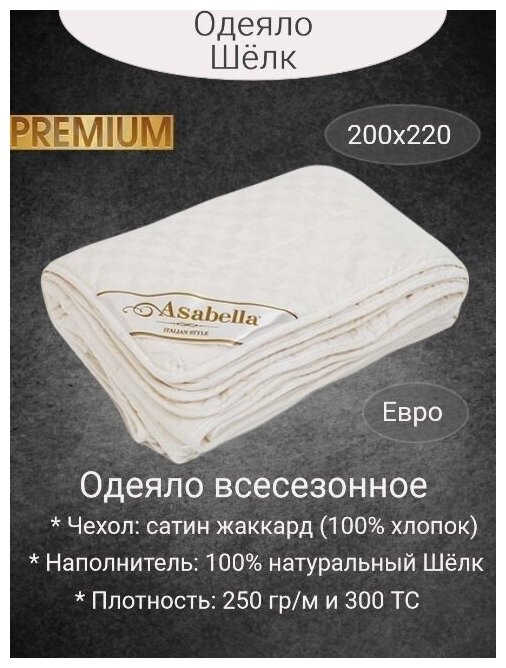 Одеяло бренда Asabella содержит в составе наполнителя - 100% шелк. Чехол одеяла выполнен из 100% хлопка жаккардовый люкс-сатин. Тонкое природное волокно протеина - продукт работы гусеницы шелкопряда, очищают от смолы, после чего оно приобретает свойство прекрасно впитывать влагу и сохранять тепло. Считается что шелк - один из самых лучших и самых дорогих наполнителей одеял. Он не вызывает аллергии, не привлекает насекомых-паразитов и является долговечным. Натуральный шелк подходит для тех людей, которым бывает жарко во время сна, т.к. шелк регулирует температуру тела в зависимости от температуры окружающей среды. Такие одеяла очень легкие, износостойкие.