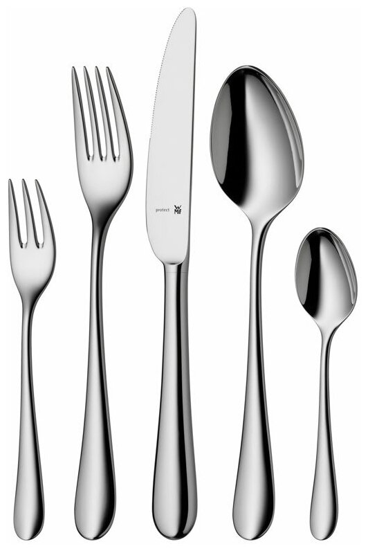 Столовые приборы Merit с удлиненной широкой ручкой выглядят, с одной стороны, классически и элегантно, с другой, традиционно и утонченно, как бы объединяя в себе прошлое и настоящее. Плавные линии и эргономичная форма обеспечивают комфортное и приятное использование, а запатентованные материалы и технологии производства гарантируют высокое качество. Эти приборы будут радовать вас и украшать ваш обеденный и праздничный стол в течение долгих лет. Набор столовых приборов из 30 предметов рассчитан на 6 персон и включает по шесть столовых вилок, ножей и ложек, десертных вилок и чайных ложек. Наборы столовых приборов WMF представлены в различных дизайнах, чтобы вы могли найти тот, который будет отвечать вашим требованиям. Этот набор подходит для ежедневного использования, при желании к нему можно приобрести дополнительные приборы.