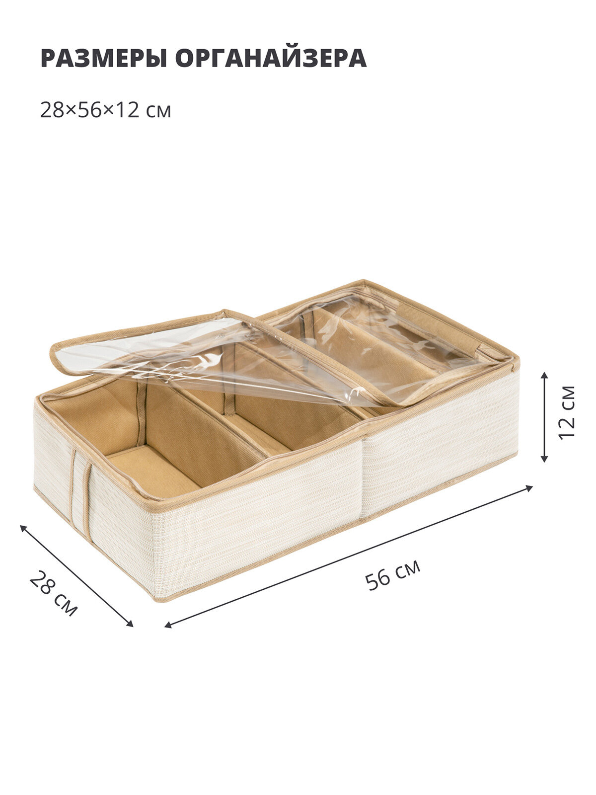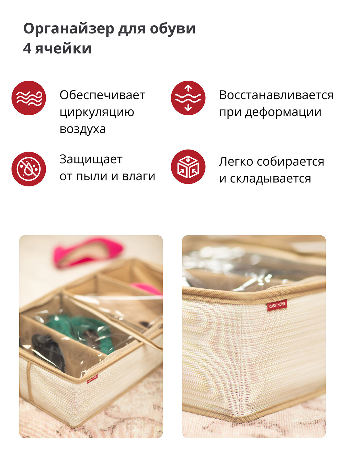 Каркас изготовлен из качественного полипропилена, который отличается прочностью и износостойкостью. Внешний чехол выполнен из экологически безопасного текстилена, который сплетен из плотных полиэстеровых нитей со специальным покрытием. Внутри аксессуара предусмотрены 4 ячейки для каждой пары обуви.