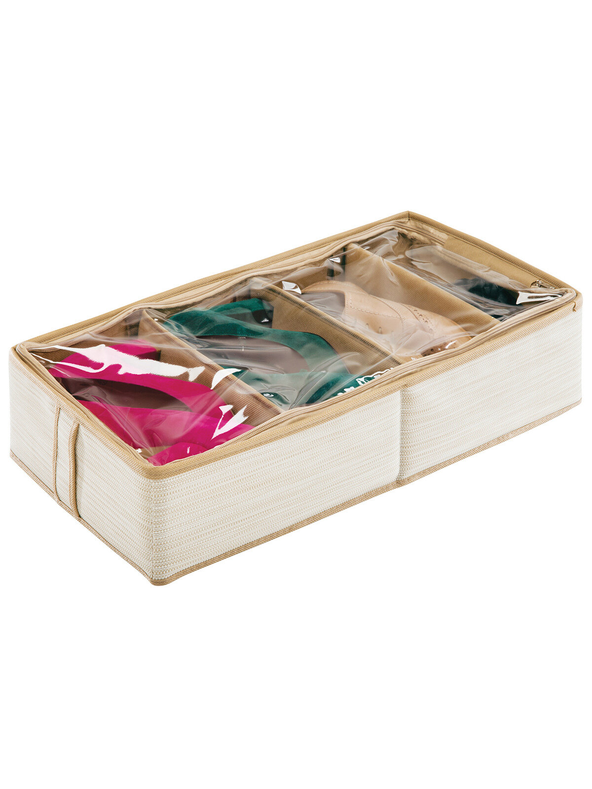 Каркас изготовлен из качественного полипропилена, который отличается прочностью и износостойкостью. Внешний чехол выполнен из экологически безопасного текстилена, который сплетен из плотных полиэстеровых нитей со специальным покрытием. Внутри аксессуара предусмотрены 4 ячейки для каждой пары обуви.
