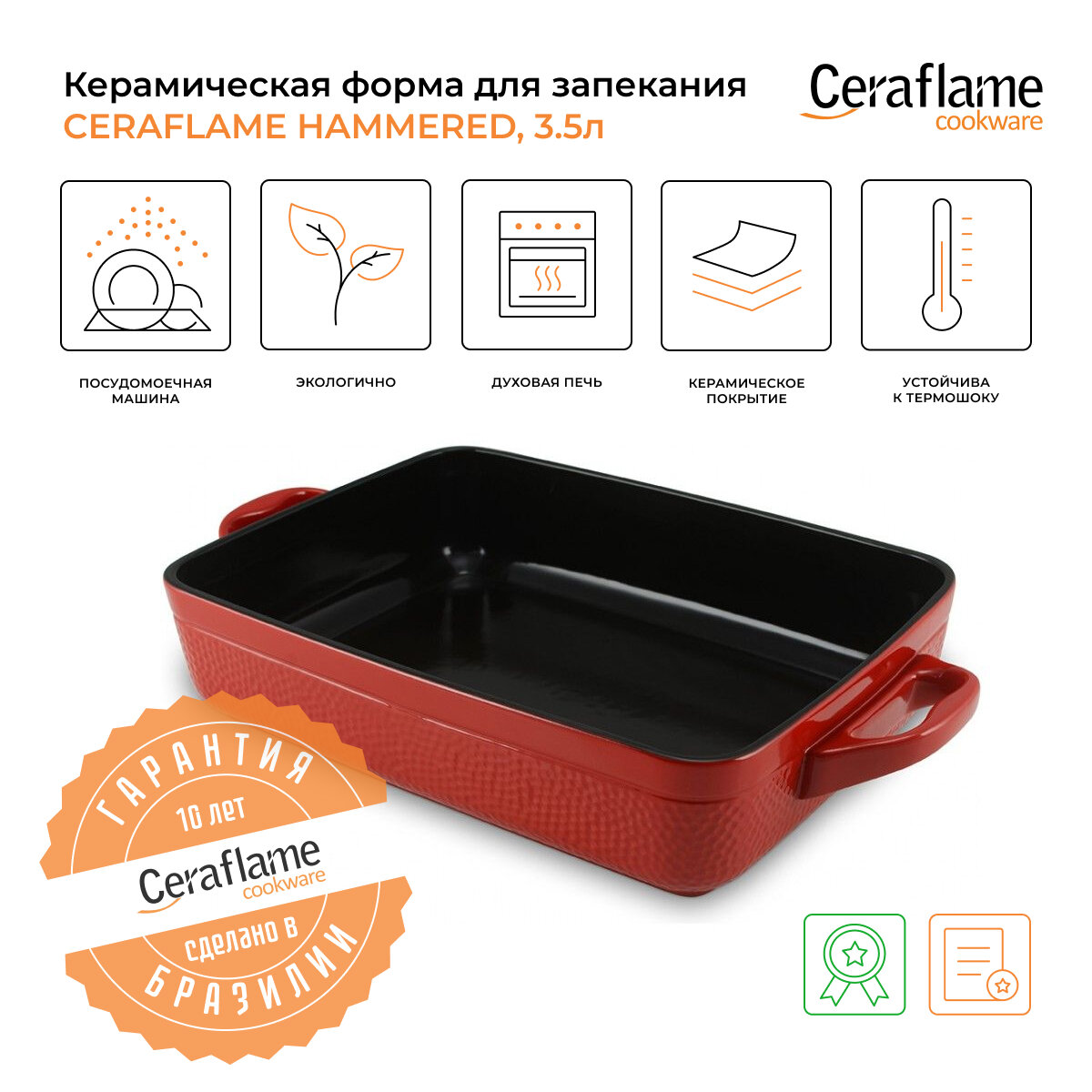 - Посуда Ceraflame обжигается при температуре 1300 градусов, поэтому свободно выдерживает нагревание до 900 градусов, то есть спокойно подойдет для газовых и электрических духовых шкафов и даже может быть использована в печи или на открытом огне.