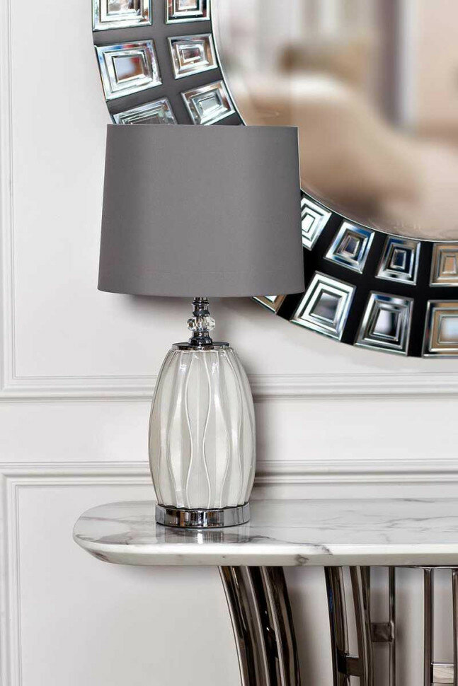 | Состав | Основание - металл никелированный цвет хром, ножка стеклянная белая; плафон - ткань серого цвета |
