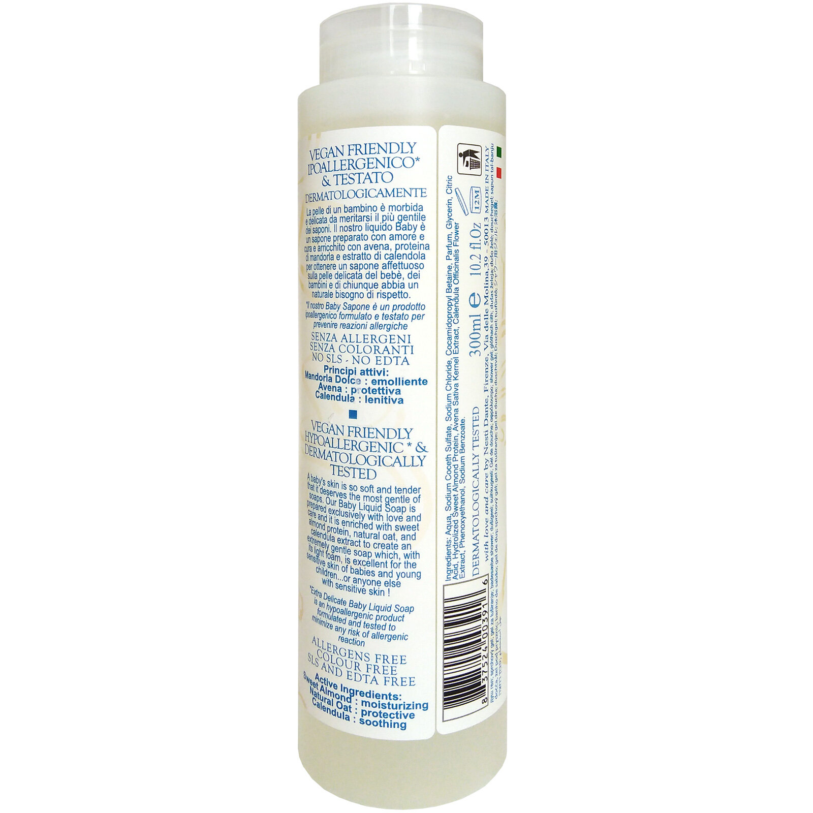 Очень нежное жидкое мыло, специально разработанное для малышей и детей Обладает растительной гипоаллергенной формулой, тестированной дерматологами Создает легкую пену, которая бережно очищает кожу Содержит протеины миндаля, которые обладают увлажняющими, защитными, питательными и успокаивающими свойствами Насыщено противовоспалительным экстрактом овса, который увлажняет и укрепляет кожу Обогащено экстрактом календулы для антисептического и заживляющего действия Делает детскую кожу мягкой и гладкой Без минеральных масел, парабенов и агрессивных компонентов.