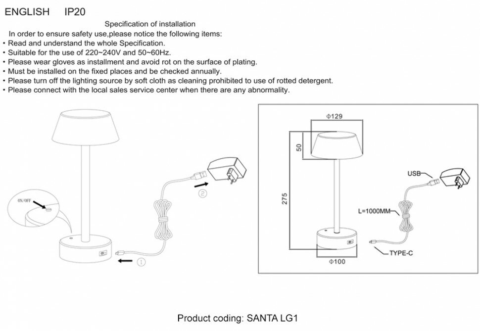 В комплекте поставки: лампа настольная, аккумулятор, блок питания, зарядный кабель.