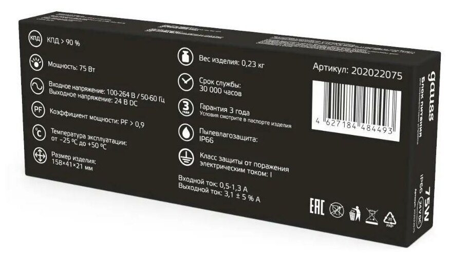 Электротовары Gauss 202022075. Придаст особый шарм вашему интерьеру. Размеры 15.8x4.1x0 cm. Параметры пылевлагозащиты IP — 66. Страна происхождения бренда — РОССИЯ.