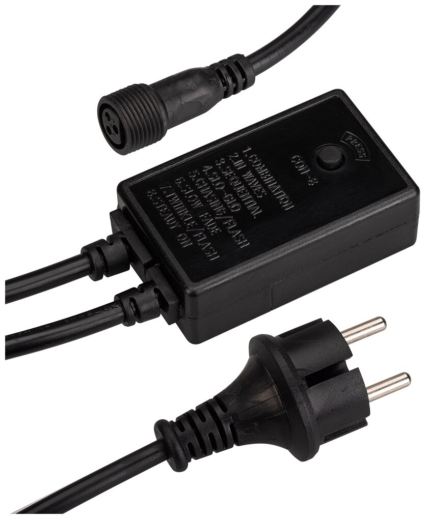 Контроллер для светодиодных гирлянд с эффектом динамики. Материал оболочки ПВХ. Цвет провода черный. В комплект входит: провод питания с вилкой европейского стандарта (IP44), 3pin разъем подключения к гирлянде, выпрямитель AC/DC (1.6A), контроллер для смены режимов динамического свечения (8 режимов). Длина провода 1.5 метра.