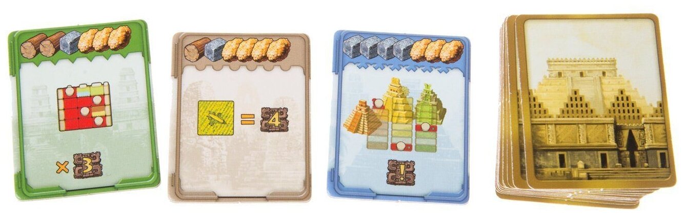 | Комплектация | игровое поле из 6 частей, 6 шестеренок, лист с наклейками, 6 фиксаторов, 24 рабочих 4 цветов, 28 маркеров 4 цветов, 4 диска 4 цветов, 65 кубиков ресурсов, 13 пластиковых черепов, 65 фишек маиса, 28 жетонов урожая, 21 жетон начального богатства, 13 жетонов дворцов, 32 жетона зданий, 4 двусторонних планшета игроков, маркер 1 игрока, правила игры |