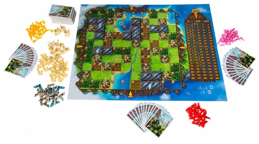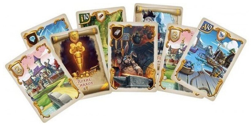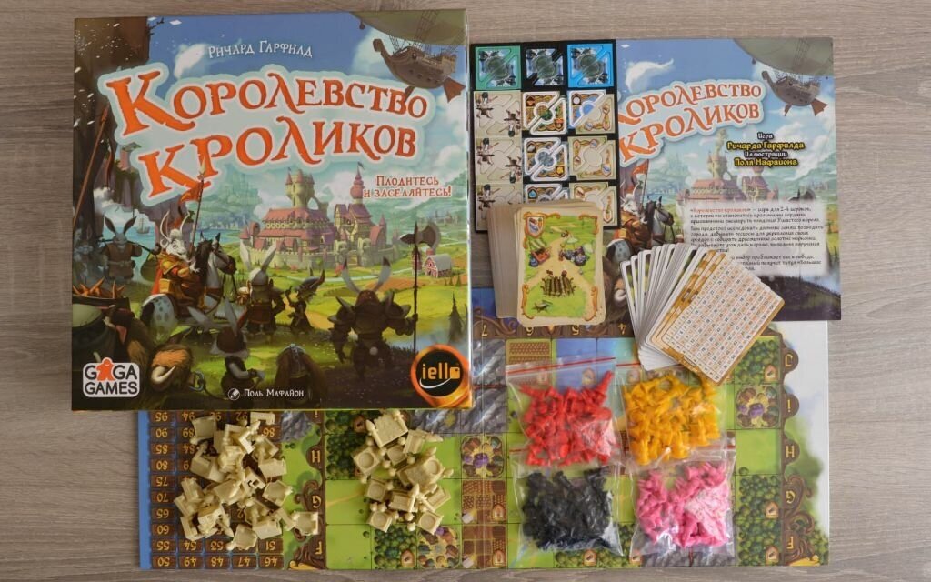 | Комплектация | 12 жетонов ферм; 144 фигурки кроликов (по 36 фигурок 4 цветов); 24 жетона строительства; 27 городов уровня силы 1; 3 города уровня силы 3; 39 фигурок городов; 4 карты помощи игроку; 6 жетонов тренировочных лагерей; 82 карты исследований; 9 городов уровня силы 2; Правила игры |
