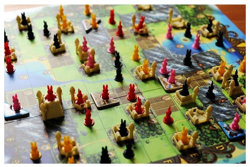 Пушистые особенностиРеиграбельности и здоровой доли случайности вносит механика драфта - вы выбираете две карты из своей руки, а оставшиеся передайте следующему игроку - он возьмет их после розыгрыша карт. Действуйте с умом - карты, которые показались вам непрезентабельными, другой противник сыграет в свою пользу! Ну а главное в этом милом королевстве - это куча фигурок кроликов разных цветов. Если уж основывать свое государство, то только с такими приятными подданными!