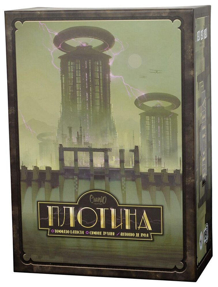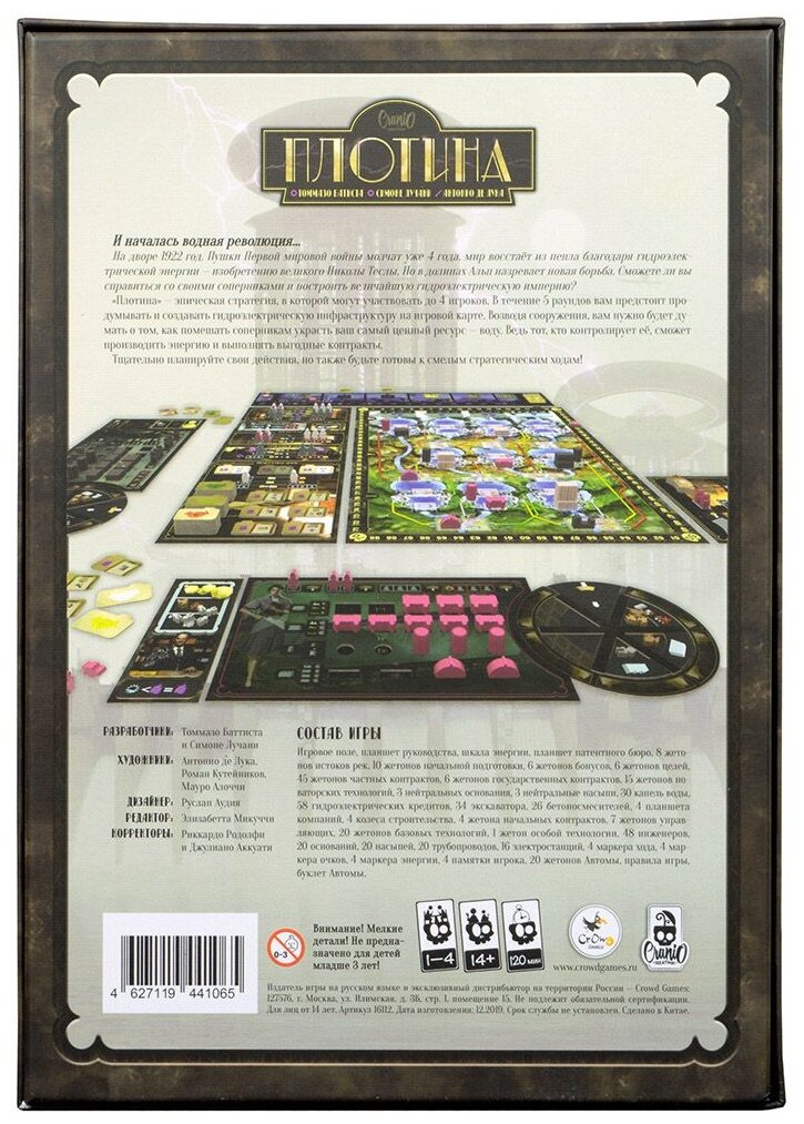 | Комплектация | игровое поле, планшет руководства, шкала энергии, планшет патентного бюро, 8 жетонов истоков рек, 10 жетонов начальной подготовки, 6 жетонов бонусов, 6 жетонов целей, 45 жетонов частных контрактов, 6 жетонов государственных контрактов, 15 жетонов новаторских технологий, 3 нейтральных основания, 3 нейтральные насыпи, 30 капель воды, 58 гидроэлектрических кредитов, 34 экскаватора, 26 бетоносмесителей, 4 планшета компаний, 4 колеса строительства, 4 жетона начальных контрактов, 7 жетонов управляющих, 20 жетонов базовых технологий, 1 жетон особой технологии, 48 инженеров, 20 оснований, 20 насыпей, 20 трубопроводов, 16 электростанций, 4 маркера хода, 4 маркера очков, 4 маркера энергии, 4 памятки игрока, 20 жетонов Автомы, правила игры, буклет Автомы. |