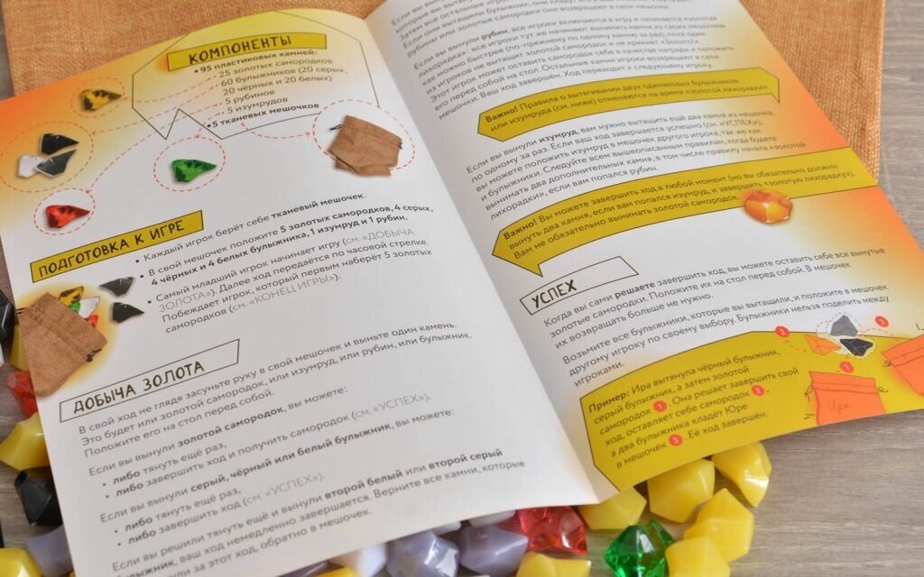 Синица в руке или журавль в небе? В настольной игре Жадюги вы сможете почувствовать себя золотоискателями, не выходя из дома. У каждого игрока в мешочке помимо «золота» булыжники, рубин и изумруд. Но всех интересует только «золото»!