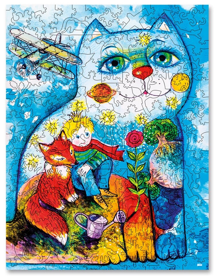 Самая известная во всем мире повесть-сказка про любовь, дружбу, одиночество и утрату. Маленький принц на своем пути встречает многих самых разных людей, короля, фонарщика и даже географа, который советует ему в своем путешествии посетить Землю. Герой много интересного узнает о жизни на Земле. Полюбившиеся всем герои сказки - Маленький принц, его друг Лис и своенравная красавица роза вписаны на изображение в улыбчивого кота.