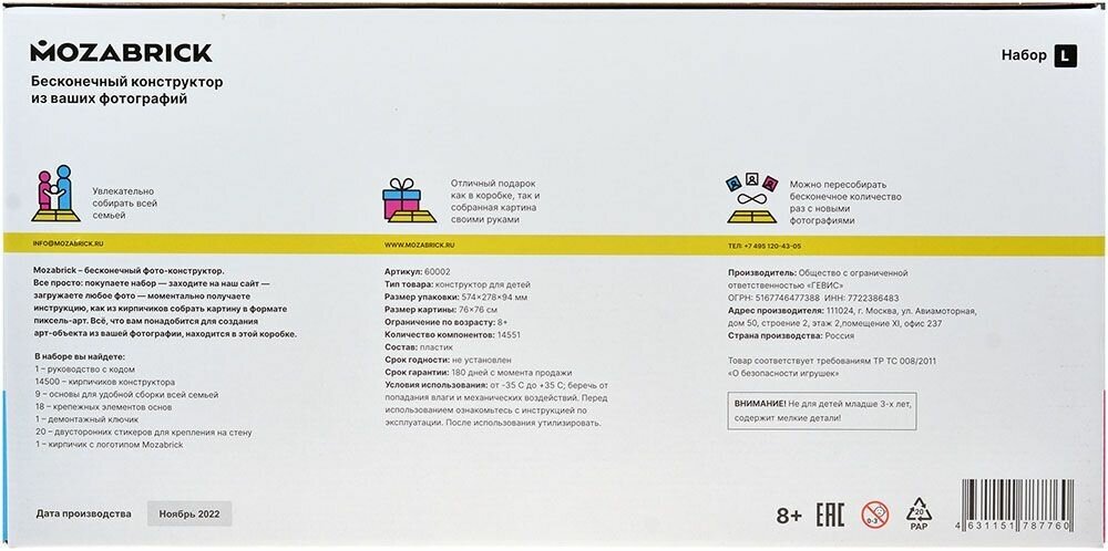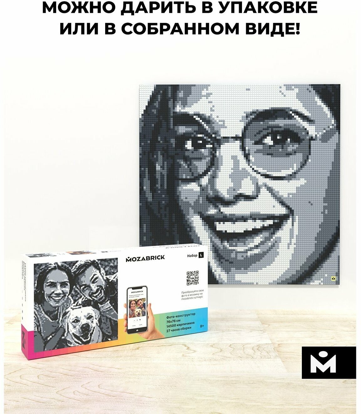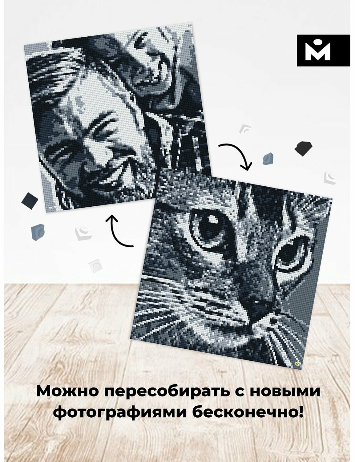 Фото-конструкторы от компании MOZABRICK – это не только яркое дополнение для вашего интерьера, но и увлекательное времяпрепровождение! С его помощью вы сможете собрать любую вашу фотографию в пиксельном стиле: просто загрузите фотографию на сайт, указанный в инструкции, и получите схему для её сборки. В любой момент картину можно пересобрать, достаточно загрузить новую фотографию. Выбирайте наборы из нескольких цветовых стилей.