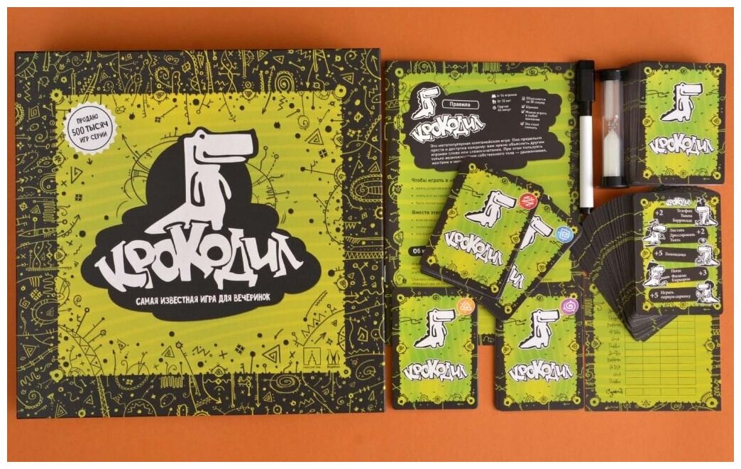 Так вот, в этой коробке — готовая вечеринка по «Крокодилу». В ней 1680 слов разной степени сложности: от наушников и батарейки до «Матрицы» и прокрастинации. А ещё карты усложнений, которые бросают вам вызов: сможете показать копьё с закрытыми глазами? А мотоцикл, стоя спиной к друзьям?