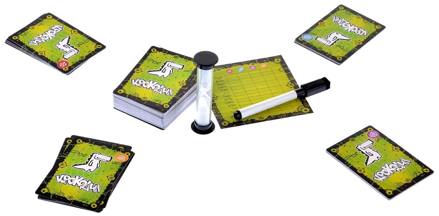 | Комплектация | 168 карт со словами; 36 карт усложнений; 1 таблица для подсчёта очков; 1 маркер; 1 песочные часы на минуту; правила игры |