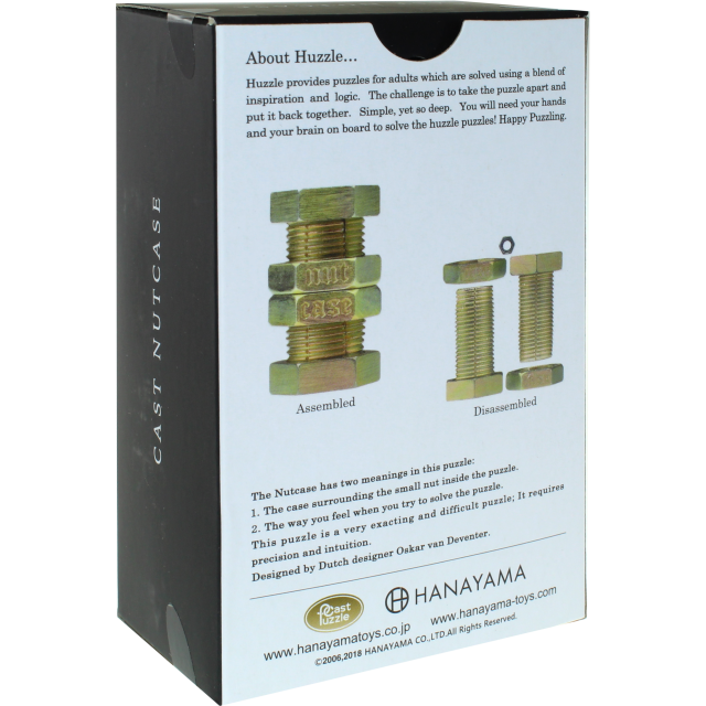 Головоломка Huzzle Cast NutCase представляет собой любопытную игрушку. Суть игры состоит в том, чтобы извлечь гайку - для этого нужно будет разобрать болты, изготовленные из металла. Вторая цель: прокрутить фигурку так, чтобы создать надпись case-nut вместо nut-case.