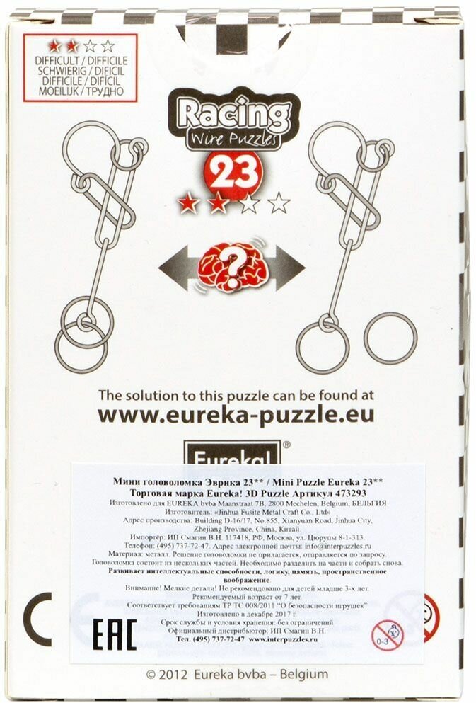 Европейское качество по доступной ценеГоловоломки Eureka проектируют в Бельгии, а производят в разных странах под контролем головного предприятия. Так компания следит за качеством, но обеспечивает доступную стоимость. Эти проволочные головоломки стильно выглядят и удобно лежат в руке. Их легко брать их в дорогу и проносить в кармане на скучные мероприятия, потому что они небольшие и лёгкие. Эврика помогает развить логику, наблюдательность, пространственное мышление и воображение, способность рассуждать нестандартно и отыскивать выход из сложных обстоятельств. Ещё они отлично тренируют мелкую моторику, что особенно полезно для детей и пожилых людей.