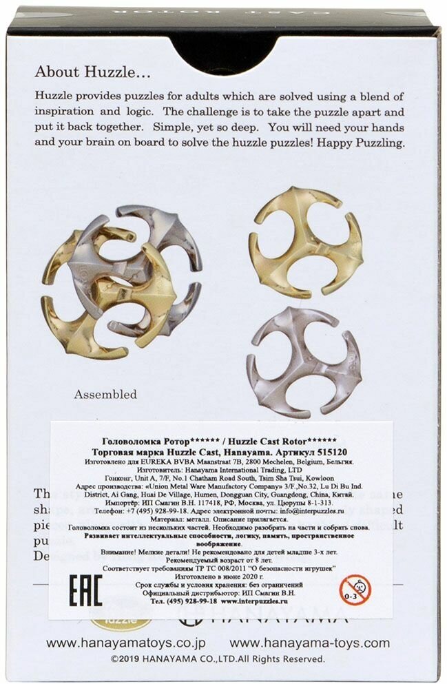 Линейка Huzzle Cast от японской компании Hanayama – это качественные металлические головоломки высокого уровня сложности, которые могут послужить отличным подарком как увлечённому фанату головоломок, так и просто человеку с пытливым умом. Чтобы решить головоломку, вам надо сначала разобрать её, а потом собрать. Причудливые формы и конструкции тщательно продуманы профессиональными создателями головоломок из стран всего мира и опираются на математические расчёты и законы физики. Качественное исполнение из металла не только гарантирует долгий срок эксплуатации, что значит, что пазл вполне может порадовать даже ваших внуков, но и делает процесс разгадки гораздо приятнее. У каждой головоломки есть своя история, какой-либо образ и ключевое слово, стоящее за её созданием и задающее ход мысли для разгадки.