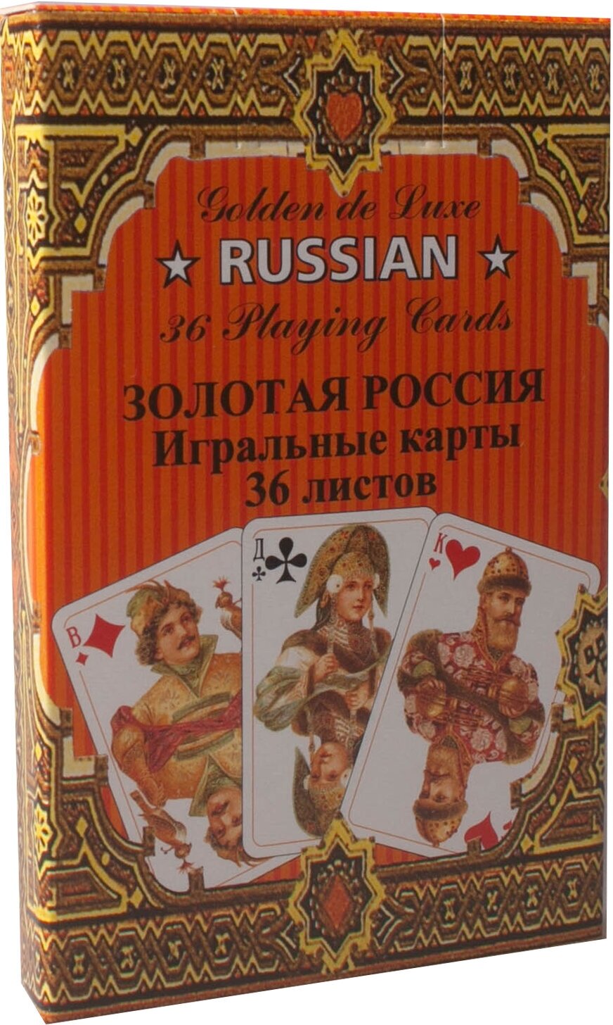 Дизайн представленной колоды «Золотая Россия» учел многие традиционные для нашего народа черты. Карты в ваших руках продемонстрируют типажи крестьянских и княжеских лиц, особенности национальных костюмов и украшений, символы власти Рубашка карт выполнена в приятных пастельных тонах с ромбиками. Колода состоит из 36 прочных пластиковых карт, а значит, с ее помощью вы сможете играть как в классического «Дурака», так и в более профессиональные карточные игры.