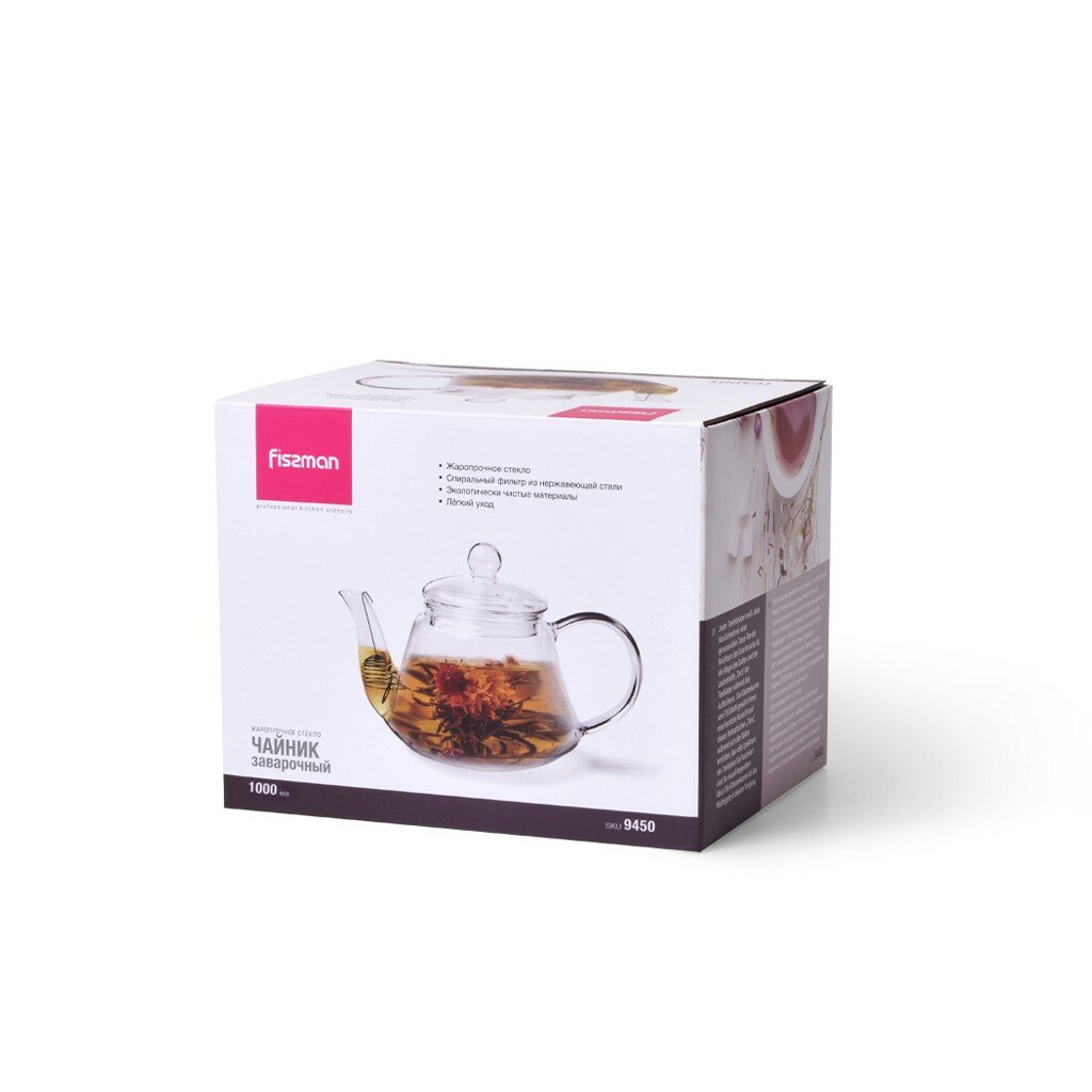 Заварочный чайник от компании Fissman изготовлен по современной технологии из особо прочного боросиликатного стекла. Для любителей зеленых или связанных цветущих чаев этот чайник станет поистине незаменимым, а также он обладает неоспоримыми преимуществами: