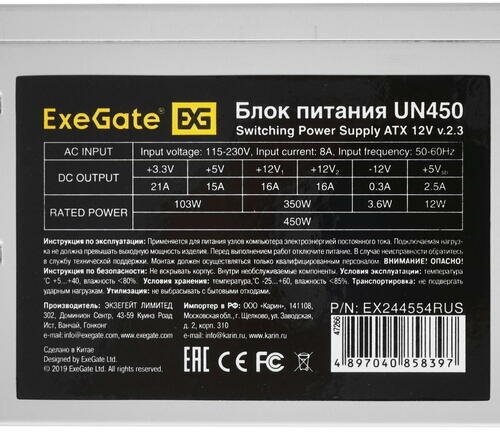 Блок питания ExeGate 450W ATX-UN450 (EX244554RUS) Grey