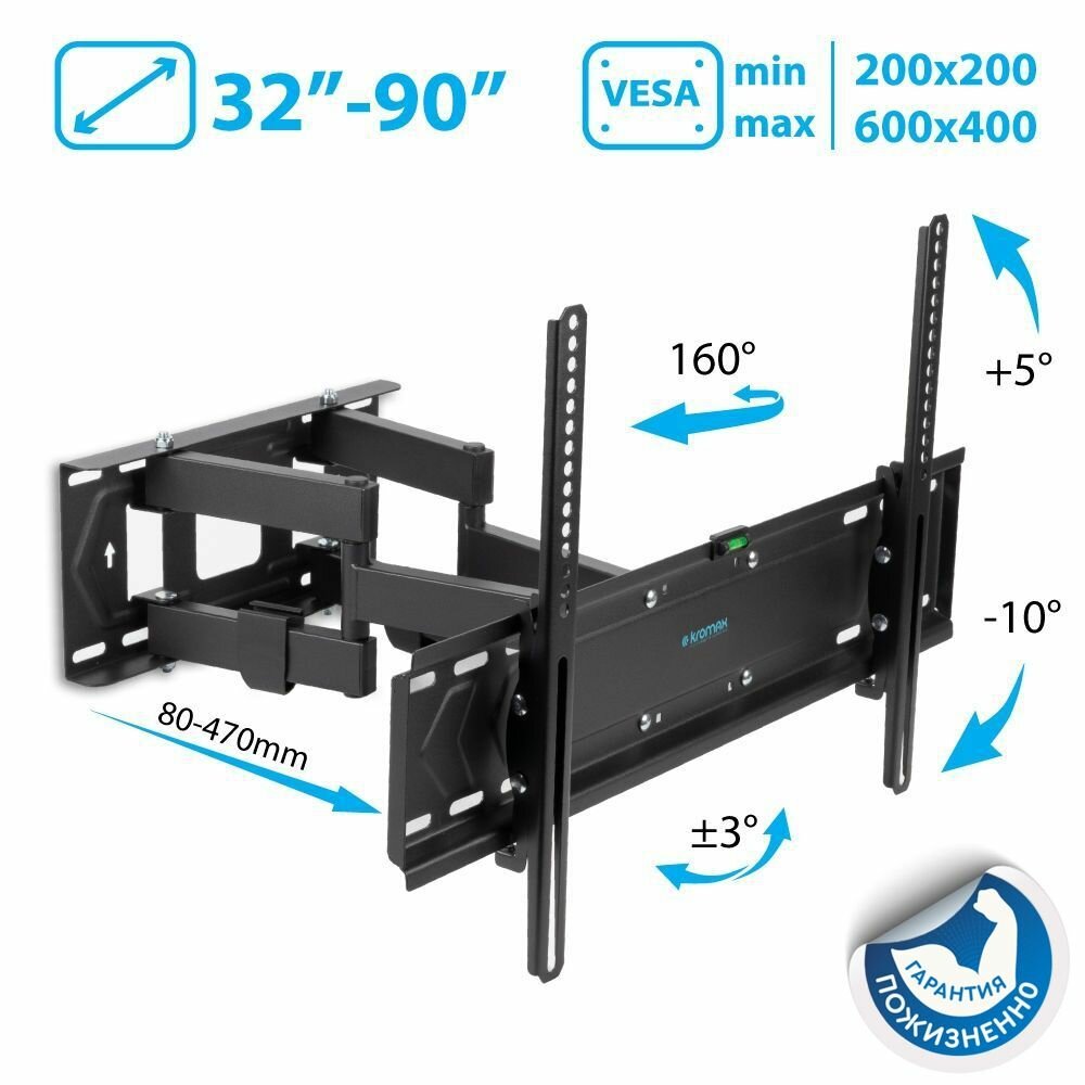 Универсальный настенный кронштейн для LED/LCD телевизоров. Позволяет легко регулировать наклон, поворот и расстояние от стены, чтобы устранить блики и обеспечить максимальный комфорт и удобство при просмотре с любой точки комнаты. Поддерживается корректировка по горизонтали в пределах 3°. Подходит для большинства панелей от 40 до 90 и весом до 50 кг. Изготовлен с учётом современных технологий производства, которые обеспечивают высокую прочность материала, что увеличивает его стойкость к нагрузкам. Водяной уровень для точной установки. Широкое монтажное основание с 4-мя отверстиями для надежного крепления. Кабель-канал позволяет избавиться от свисающих проводов позади телевизора, организует порядок и создаст аккуратный вид.