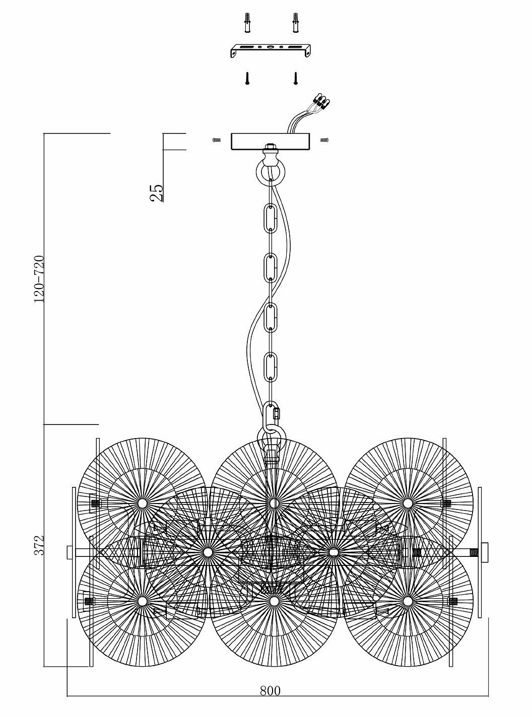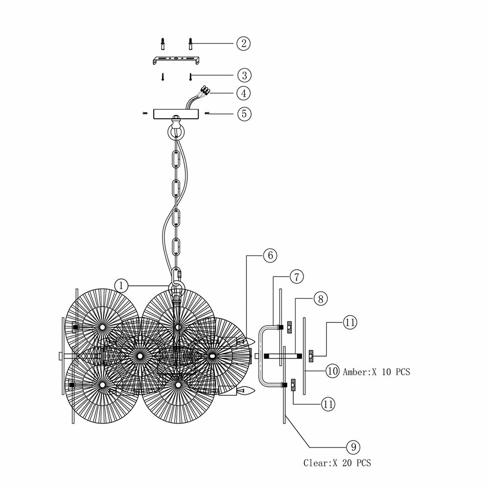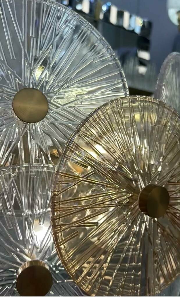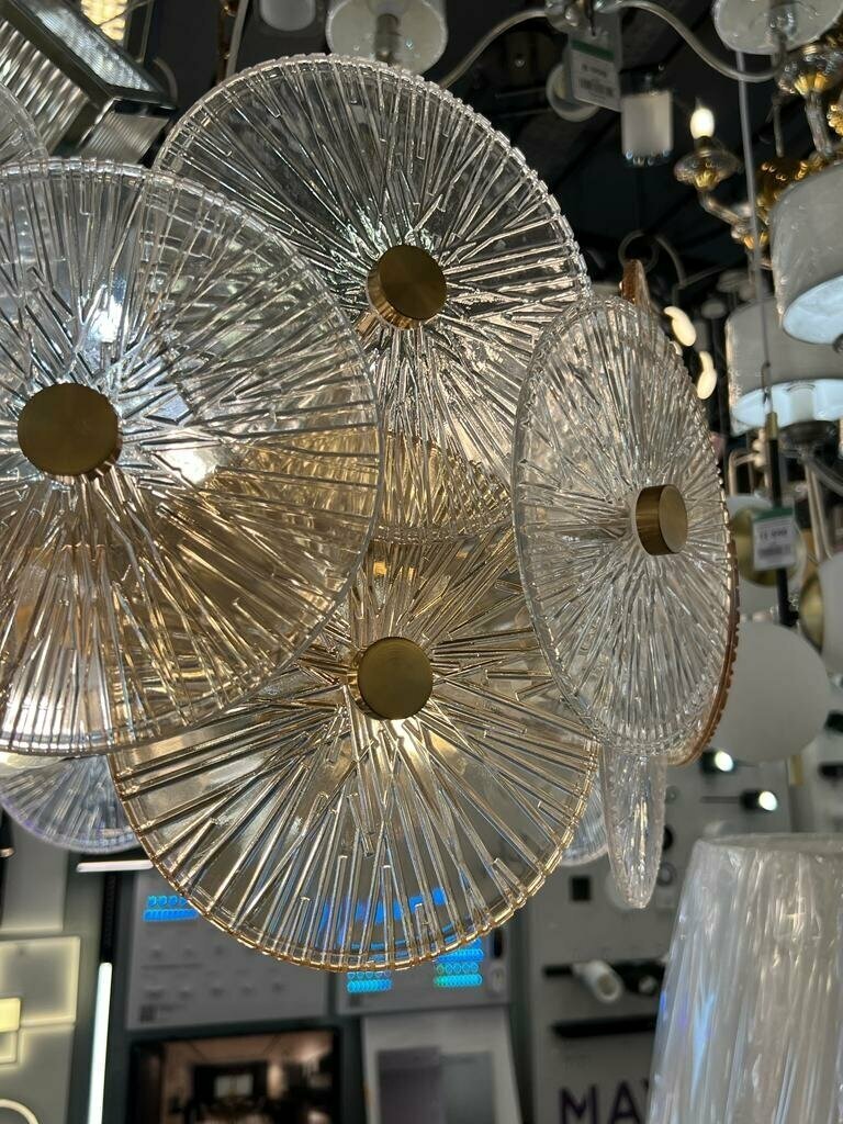 | Дополнительные характеристики | округлые элементы выполнены из штампованного стекла в двух оттенкахпрозрачном и янтарном; высоту подвесных светильников можно отрегулировать с помощью цепи |
