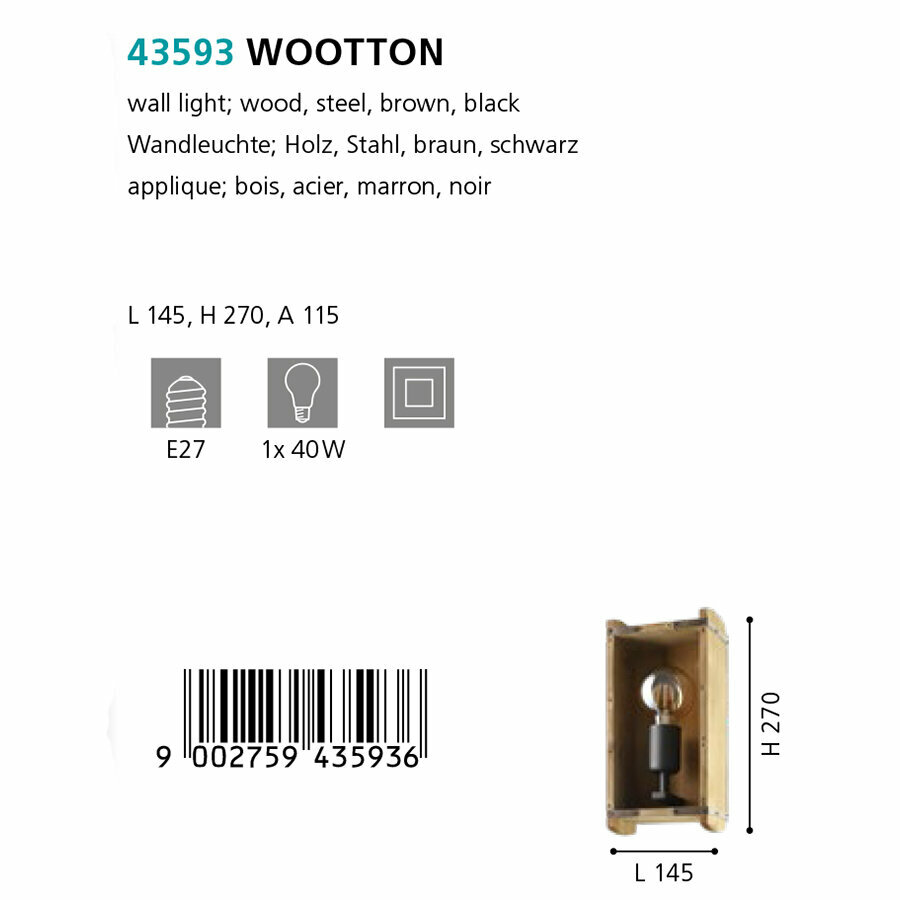 | Номенклатура | 43593 Бра WOOTTON, 1Х40W, E27, L145, H270, A115, сталь/дерево, черный/коричневый |