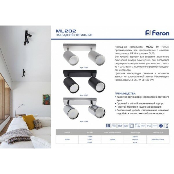 Светильник Feron 41068. Освежит ваш интерьер. Размеры 21x5.6x16.8 cm. Параметры пылевлагозащиты IP — 20. Материал/цвет арматуры алюминий/хром. Использует лампу с цоколем GU10. Страна происхождения бренда — Россия.