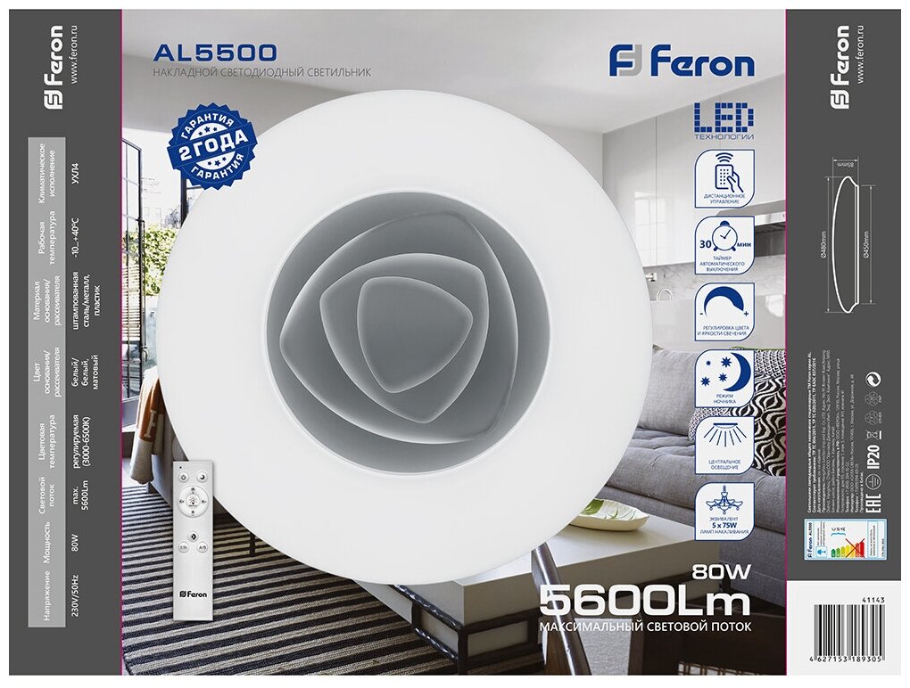 Светильник накладной светодиодный, потолочный управляемый (ДПО) FERON , 80W, 3000К-6500K (теплый-белый-дневной), 230V, 5600Lm, IP20, угол рассеивания 120°, цвет белый, корпус штампованная сталь, рассеиватель матовый пластик и металл, 480*480*85