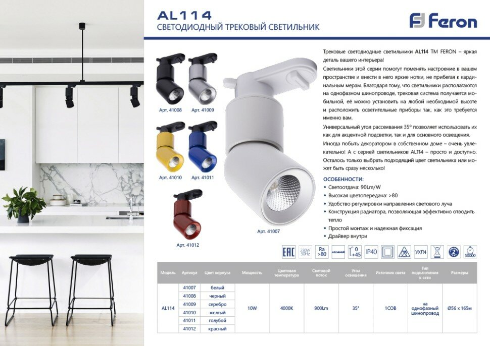 Трековый светильник Feron 41009 AL114